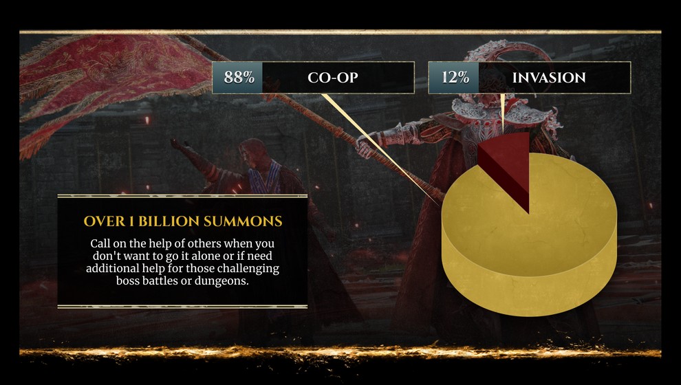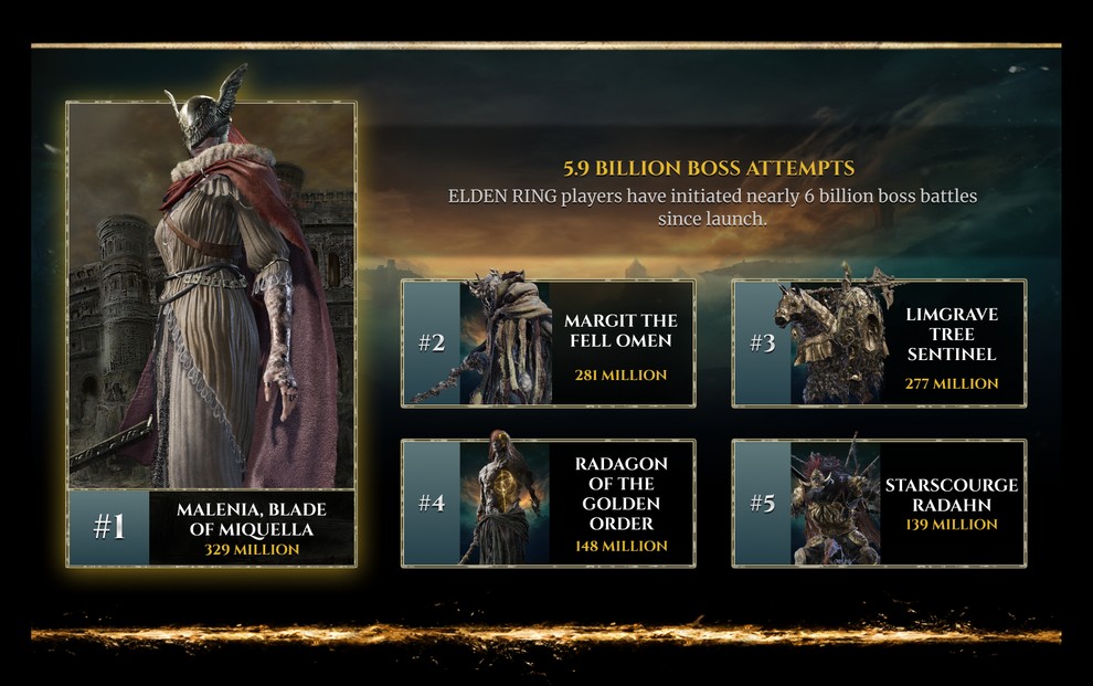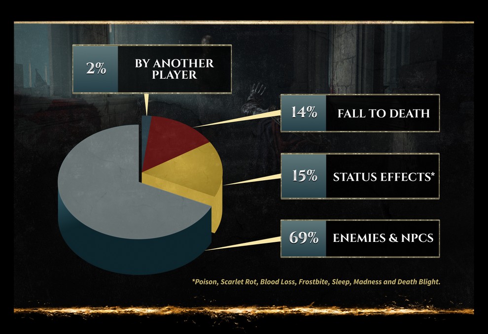 Bandai Namco решила поделиться некоторой статистикой Elden Ring. Так, согласно цифрам, игроки разбивались насмерть чаще, чем погибали в битвах с другими игроками, а Драконий Страж Древа, с которым «погасшие» сталкиваются в самом начале, вошел в пятерку самых суровых боссов по числу попыток их одолеть.
