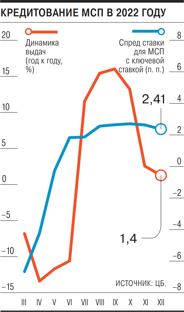 Как видно из графика, помесячная динамика займов МСП в 2022 году была более чем неоднородной. После заметного падения в марте—июне (вплоть до минус 13,4% в апреле в измерении год к году) последовал рост (максимальный — плюс 16,6% в сентябре). Однако уже к концу года (в том числе из-за роста числа отказов в выдаче займов из-за так называемых мобилизационных рисков; см. “Ъ” от 26 января) прирост объемов кредитования иссяк. В декабре прирост выдач составил лишь 1,4%, что может свидетельствовать и о насыщении спроса на кредиты.