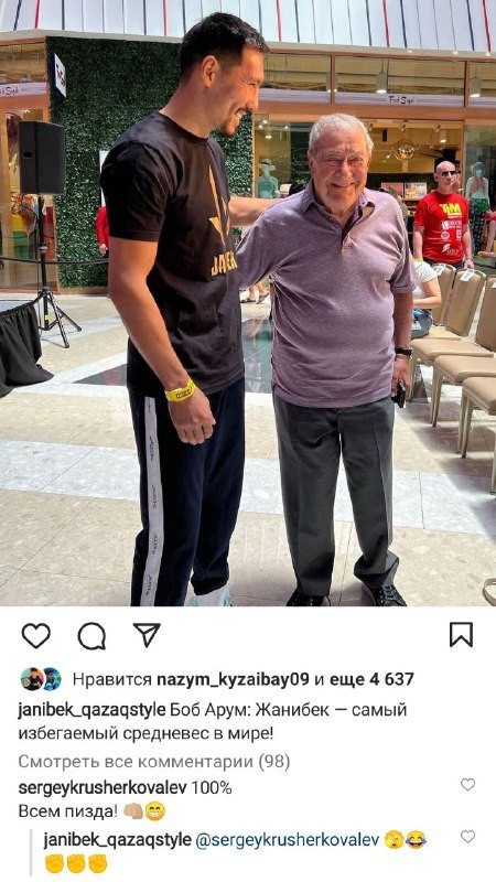 «Боб Арум: Жанибек – самый избегаемый средневес в мире!» – гласит надпись под совместной фотографией казахстанца с главой промоутерской компании Top Rank Boxing.