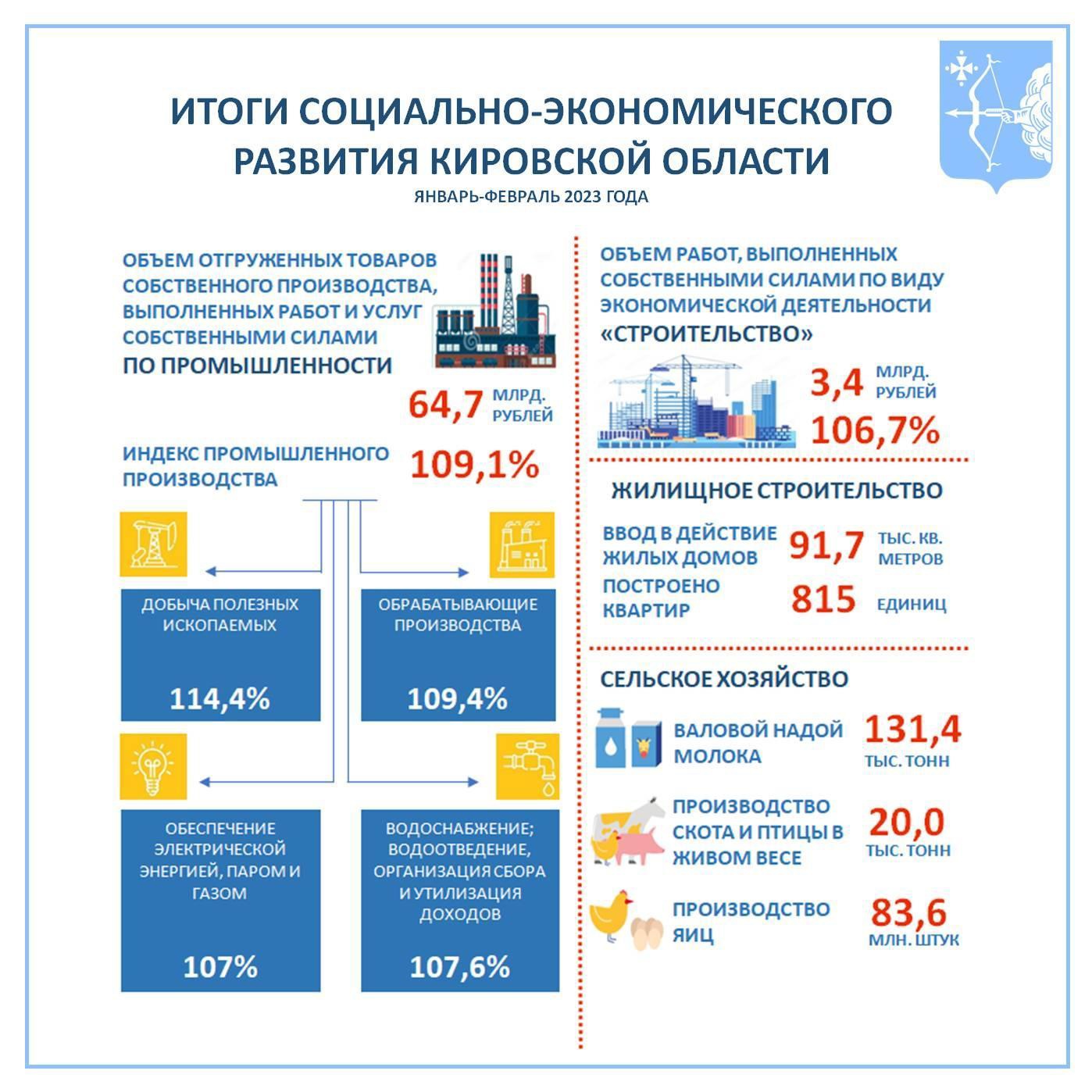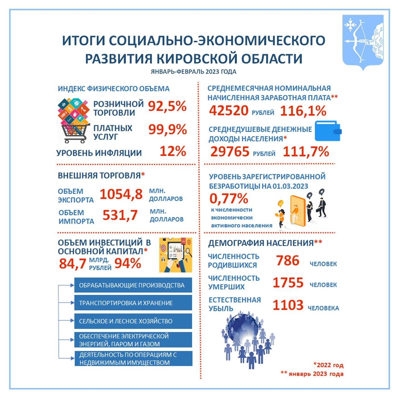 Министерство экономического развития Кировской области подвело итоги социально-экономического развития за январь-февраль 2023 года. Подробная информация появилась на стене паблика ведомства.