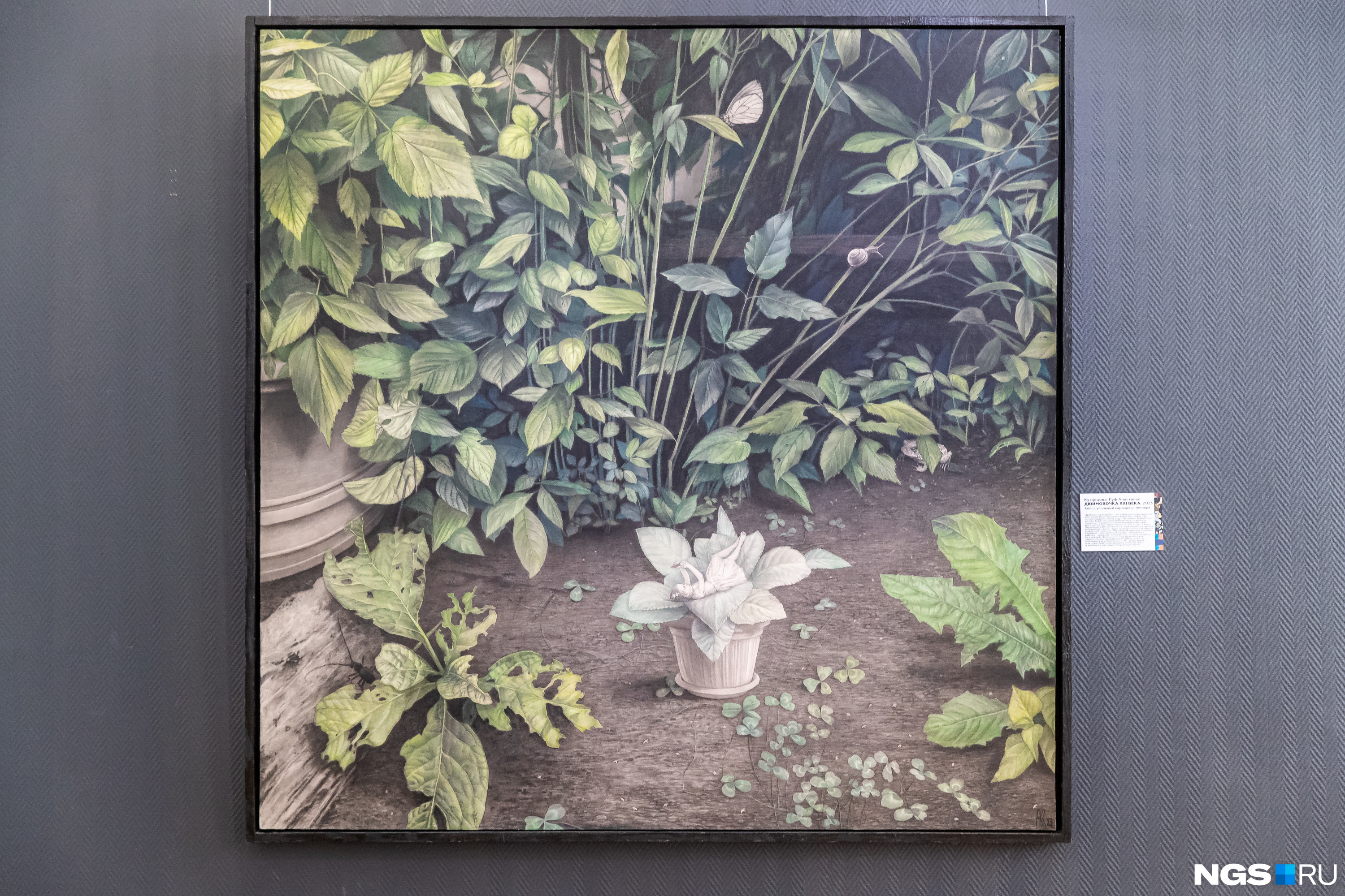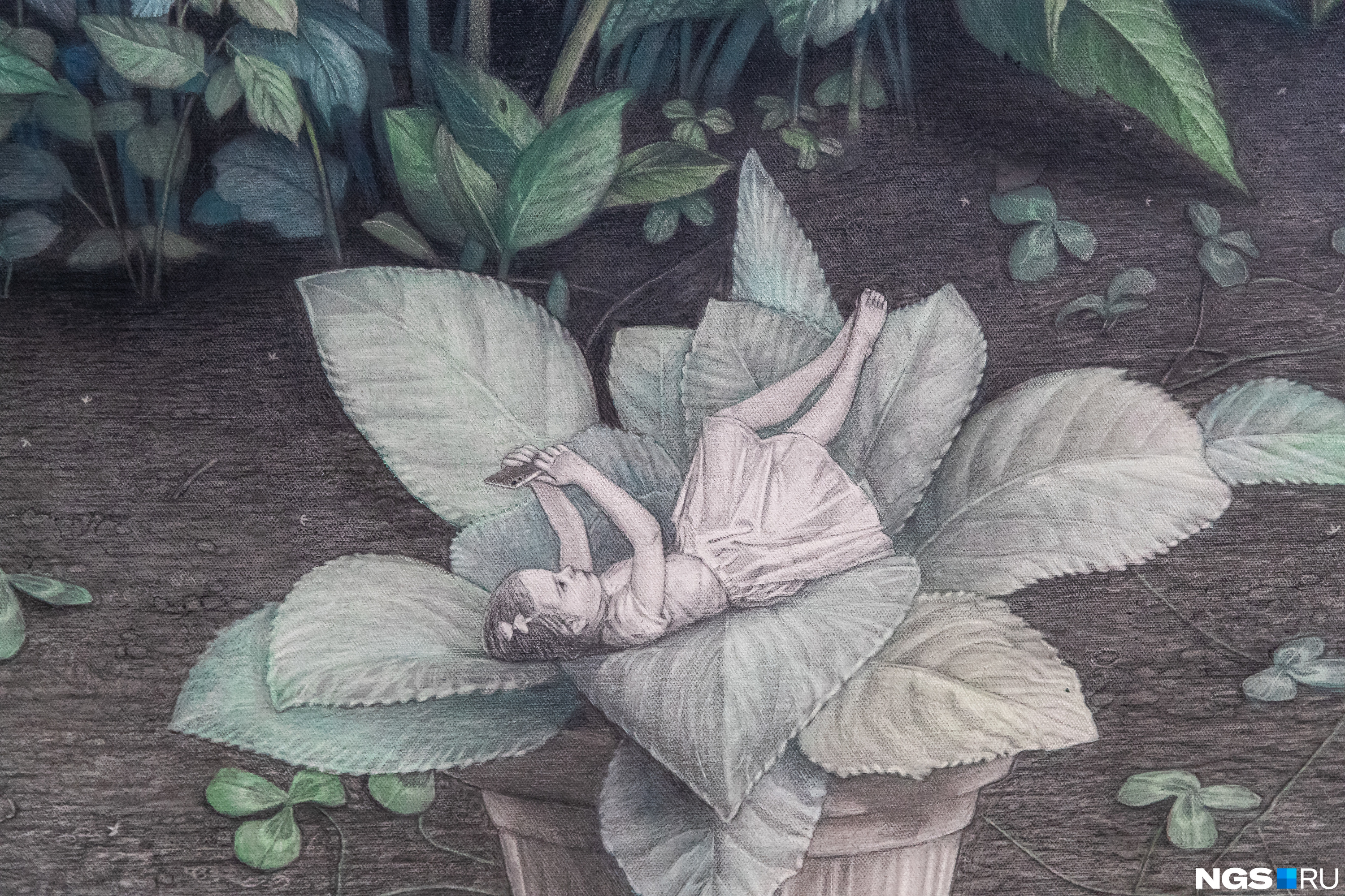Картина с Дюймовочкой художницы Анастасии Кузнецовой-Руф. Если приглядеться, Дюймовочка занята не реальным миром, а происходящим в смартфоне