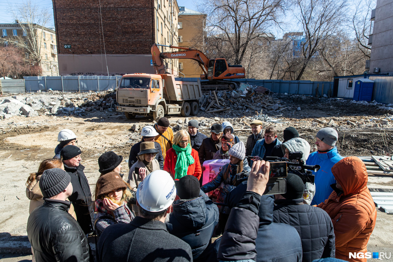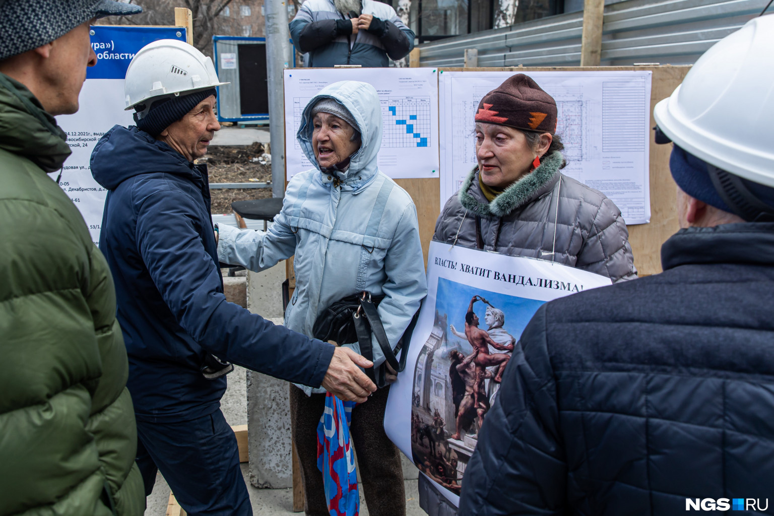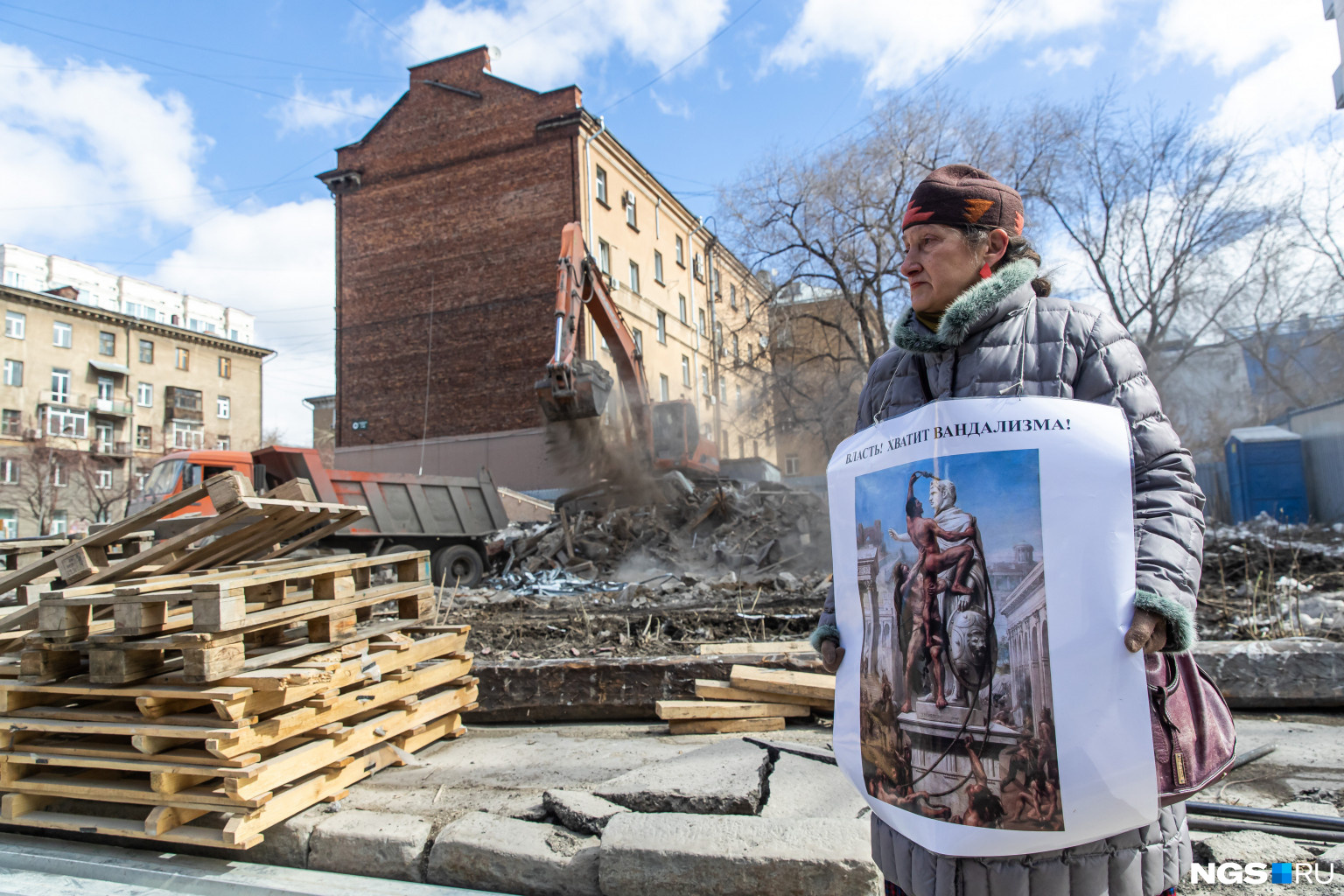 Дом Кондратюка еще на прошлой неделе, 7 апреля, превратился в руины. 11 апреля на его обломках должны были собраться журналисты и чиновники для «выездного совещания». Мэрия хотела показать городу, что «процесс реконструкции», а именно в рамках него якобы снесли здание, идет своим чередом. Но мирный план нарушил пикет председателя Новосибирского отделения всероссийского общества охраны памятников истории и культуры Натальи Шаминой.