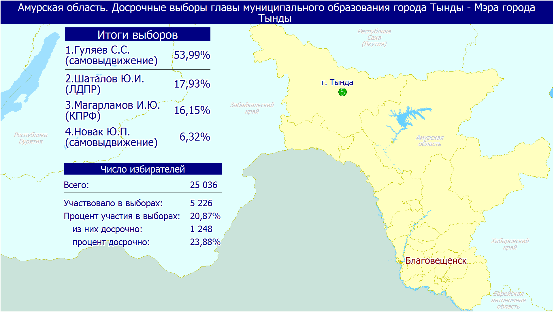 Досрочные выборы главы муниципального образования города Тынды - Мэра города Тынды признаны состоявшимися. В выборах приняло участие 20,87 процента от общего числа зарегистрированных избирателей. По предварительным данным, большинство голосов избирателей (53,99 %) получил Гуляев Сергей Сергеевич, выдвинутый в порядке самовыдвижения.
