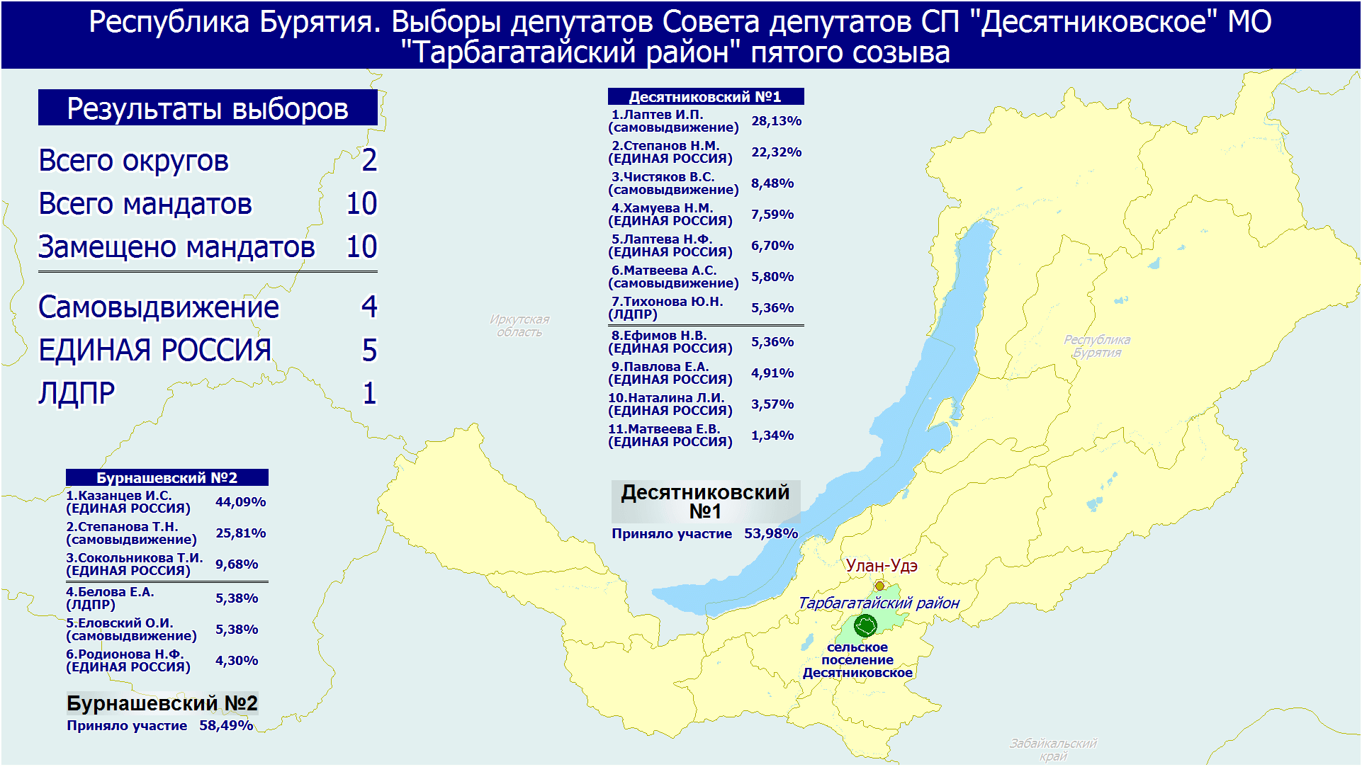 В Тарбагатайском районе прошли выборы депутатов Совета депутатов сельского поселения «Десятниковское» пятого созыва. Выборы признаны состоявшимися. Замещалось десять депутатских мандатов по двум многомандатным избирательным округам. По предварительным данным, большинство голосов избирателей получили пять кандидатов, выдвинутых избирательным объединением «Тарбагатайское местное отделение Всероссийской политической партии «ЕДИНАЯ РОССИЯ», четыре кандидата, выдвинутые в порядке самовыдвижения, и один кандидат, выдвинутый избирательным объединением «Бурятское региональное отделение Политической партии ЛДПР - Либерально-демократическая партия России».