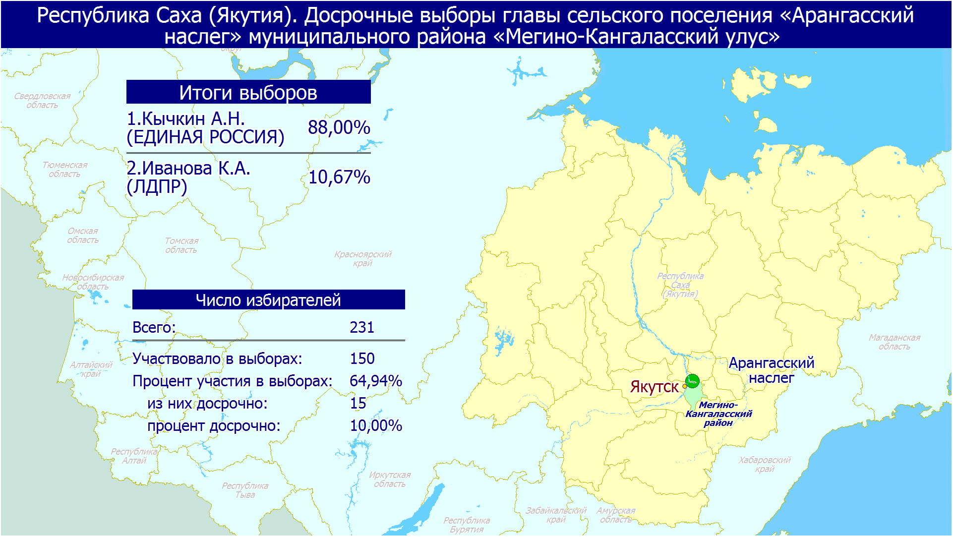 В Мегино-Кангаласском улусе прошли досрочные выборы главы сельского поселения «Арангасский наслег». Выборы признаны состоявшимися. В выборах приняло участие 64,94 процента от общего числа зарегистрированных избирателей. По предварительным данным, большинство голосов избирателей (88 %) получил Кычкин Андрей Никитич, выдвинутый избирательным объединением «Местное отделение Всероссийской политической партии «ЕДИНАЯ РОССИЯ» в Мегино-Кангаласском улусе Республики Саха (Якутия)».