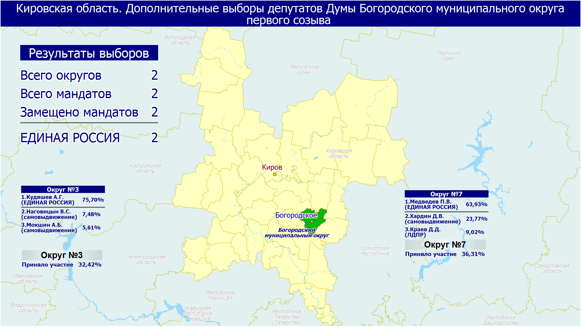 Дополнительные выборы депутатов Думы Богородского муниципального округа первого созыва признаны состоявшимися. Замещалось два депутатских мандата по одномандатным избирательным округам. По предварительным данным, большинство голосов избирателей получили два кандидата, выдвинутые избирательным объединением «Кировское региональное отделение Всероссийской политической партии «ЕДИНАЯ РОССИЯ».