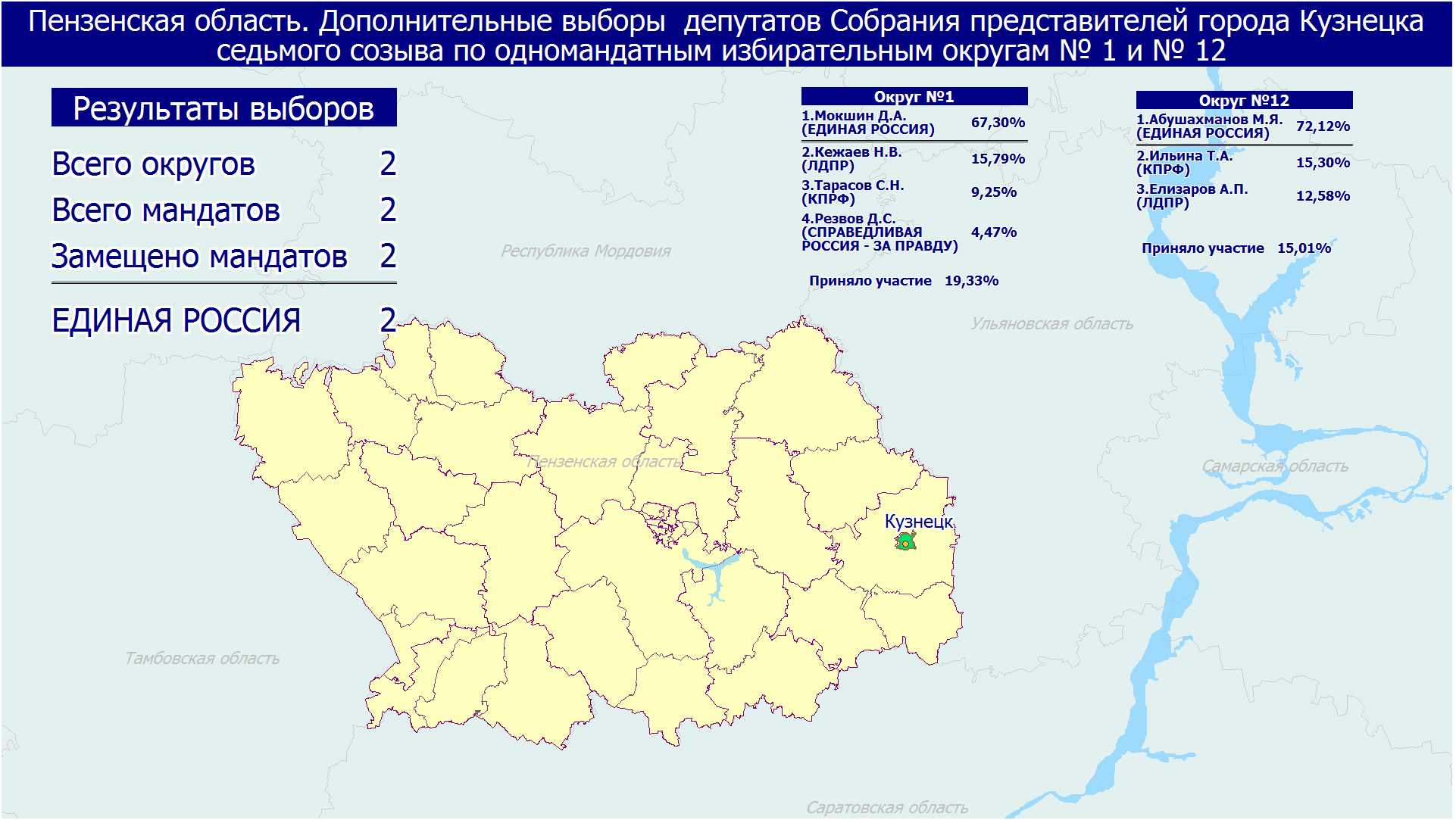 8 - 9 апреля проводилось голосование на дополнительных выборах депутатов Собрания представителей города Кузнецка седьмого созыва по одномандатным избирательным округам № 1 и № 12. Выборы признаны состоявшимися. По предварительным данным, большинство голосов избирателей получили два кандидата, выдвинутые избирательным объединением «Кузнецкое городское местное отделение Всероссийской политической партии «ЕДИНАЯ РОССИЯ».