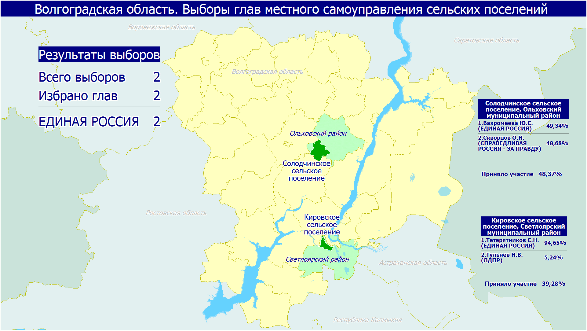 В двух районах прошли выборы глав Солодчинского сельского поселения Ольховского района и Кировского сельского поселения Светлоярского района. Выборы признаны состоявшимися. По предварительным данным, большинство голосов избирателей получили два кандидата, выдвинутые избирательным объединением «Всероссийская политическая партия «ЕДИНАЯ РОССИЯ».