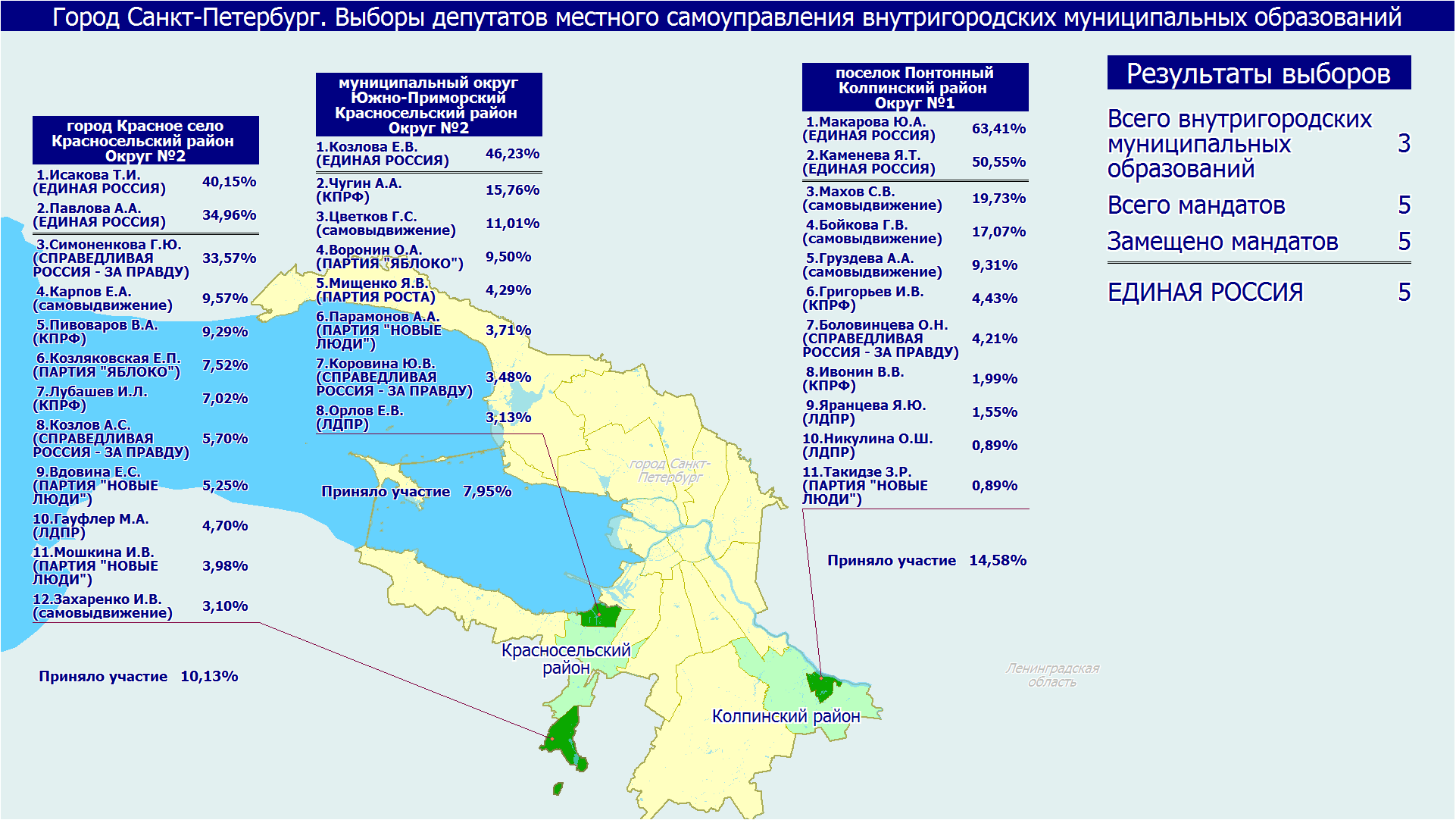 В двух районах прошли выборы депутатов представительных органов внутригородского муниципального образования поселок Понтонный Колпинского района, внутригородских муниципальных образований муниципальный округ Южно-Приморский и город Красное Село Красносельского района. Выборы признаны состоявшимися. Замещалось пять депутатских мандатов. По предварительным данным, большинство голосов избирателей получили пять кандидатов, выдвинутых избирательным объединением «Всероссийская политическая партия «ЕДИНАЯ РОССИЯ».