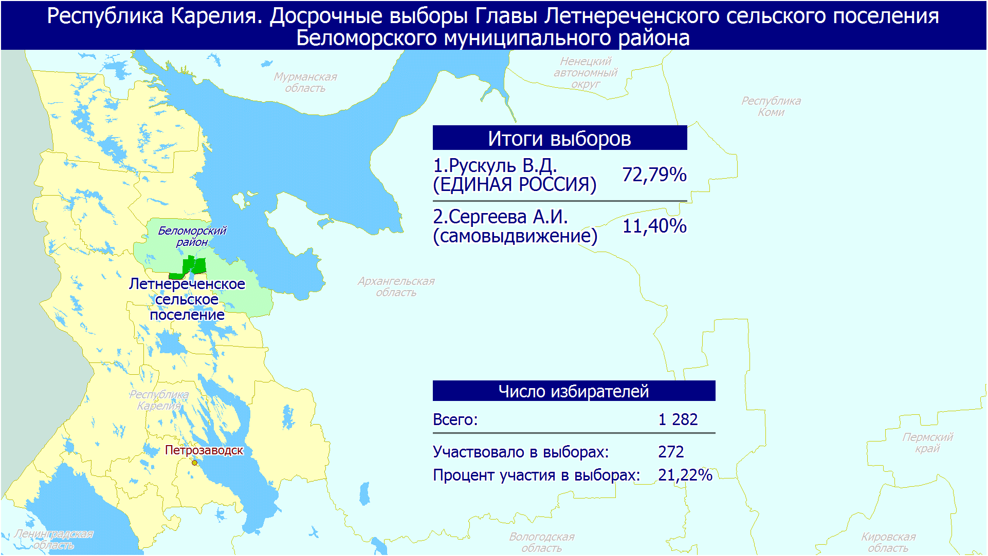 8 - 9 апреля в Беломорском муниципальном районе проводилось голосование на досрочных выборах Главы Летнереченского сельского поселения. Выборы признаны состоявшимися. В выборах приняло участие 21,22 процента от общего числа зарегистрированных избирателей. По предварительным данным, большинство голосов избирателей (72,79 %) получила Рускуль Вероника Дмитриевна, выдвинутая избирательным объединением «Беломорское местное отделение Всероссийской политической партии «ЕДИНАЯ РОССИЯ».