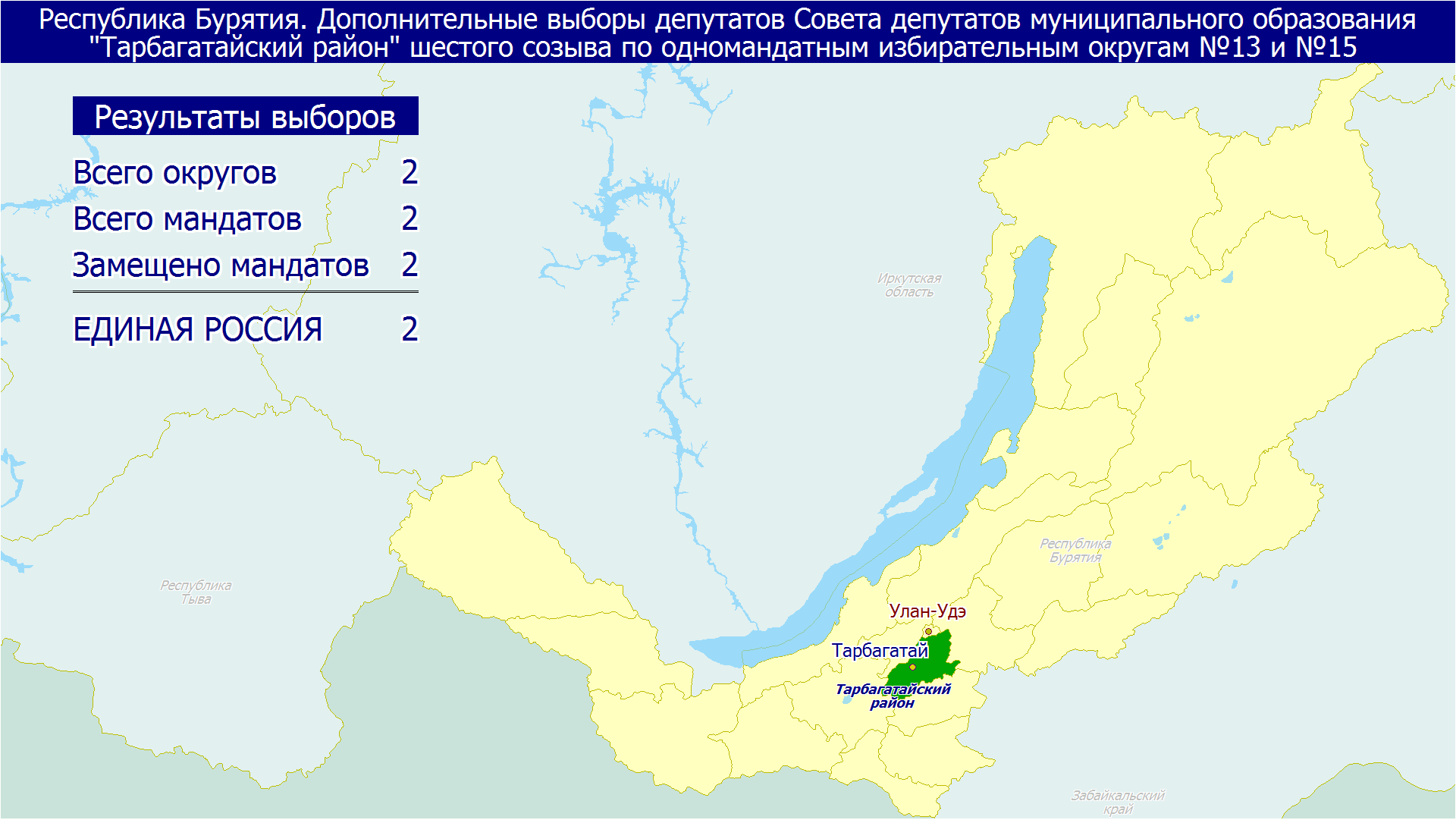 Дополнительные выборы депутатов Совета депутатов муниципального образования «Тарбагатайский район» шестого созыва по одномандатным избирательным округам № 13 и № 15 признаны состоявшимися. По предварительным данным, большинство голосов избирателей получили два кандидата, выдвинутые избирательным объединением «Тарбагатайское местное отделение Всероссийской политической партии «ЕДИНАЯ РОССИЯ».