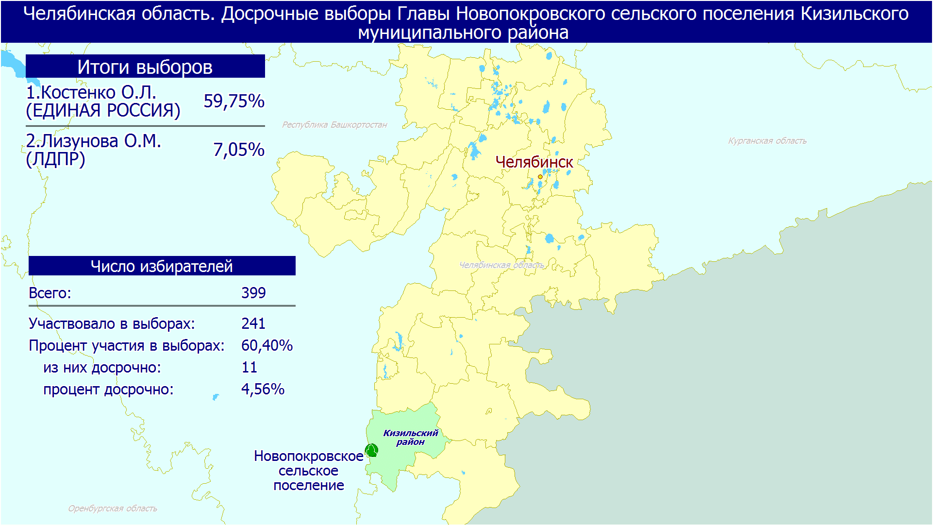 В Кизильском муниципальном районе прошли досрочные выборы Главы Новопокровского сельского поселения. Выборы признаны состоявшимися. В выборах приняло участие 60,4 процента от общего числа зарегистрированных избирателей. По предварительным данным, большинство голосов избирателей (59,75 %) получила Костенко Ольга Леонидовна, выдвинутая избирательным объединением «Кизильское местное отделение Челябинского регионального отделения Всероссийской политической партии «ЕДИНАЯ РОССИЯ».