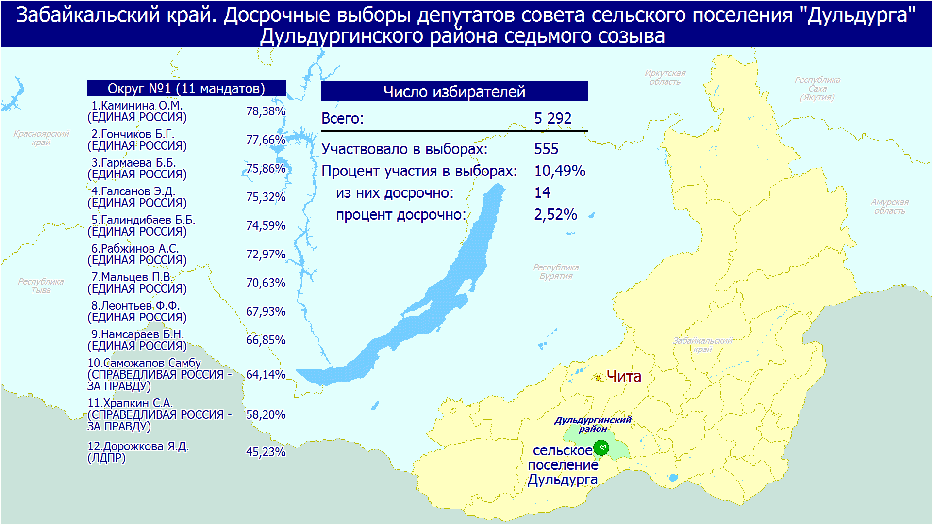 В Дульдургинском районе прошли досрочные выборы депутатов совета сельского поселения «Дульдурга» седьмого созыва. Выборы признаны состоявшимися. Замещалось 11 депутатских мандатов по многомандатному избирательному округу. В выборах приняло участие 10,49 процента от общего числа зарегистрированных избирателей. По предварительным данным, большинство голосов избирателей получили девять кандидатов, выдвинутых избирательным объединением «Дульдургинское местное отделение Забайкальского регионального отделения Всероссийской политической партии «ЕДИНАЯ РОССИЯ», и два кандидата, выдвинутые избирательным объединением «Местное отделение Социалистической политической партии «СПРАВЕДЛИВАЯ РОССИЯ – ПАТРИОТЫ – ЗА ПРАВДУ» муниципального района «Дульдургинский район» Забайкальского края».