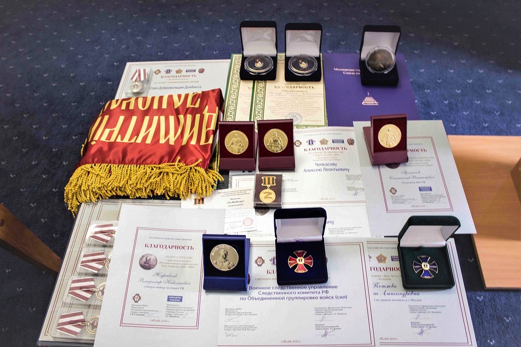 Памятные медали и благодарности вручаются от Председателя ИППО, Председателя Ассоциации юристов России, генерал-полковника Степашина С.В., Руководителя Центрального Исполкома Общероссийской организации «Офицеры России» генерал-лейтенанта Михайлова А.Г., Президента Клуба Военачальников Российской Федерации, генерала армии Куликова А.С., Председателя Совета ветеранов Службы внешней разведки России (СВР) генерал-лейтенанта Погудина М.В. и помощника руководителя Международного совета Российских соотечественников, Почетного адвоката России Коровникова В.А.
