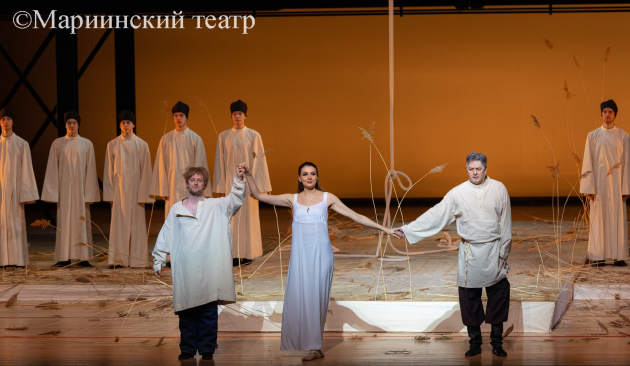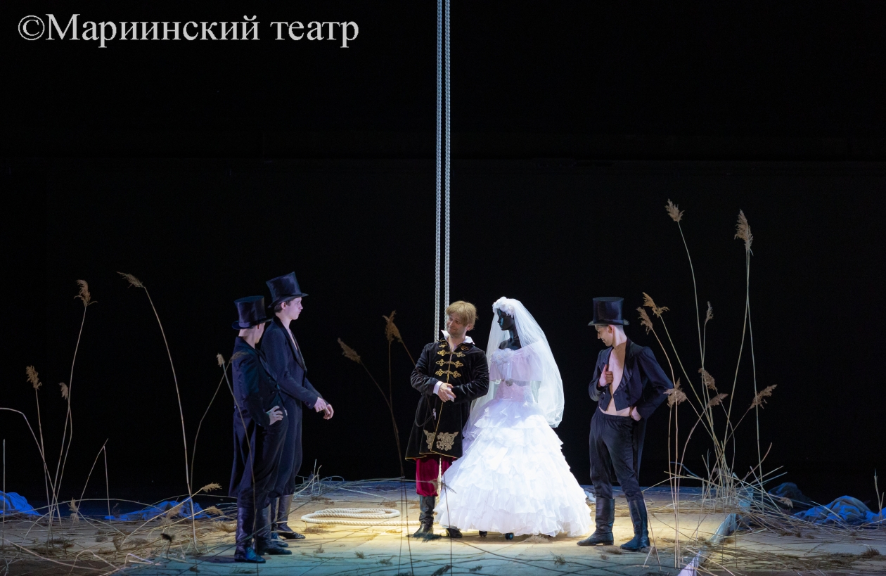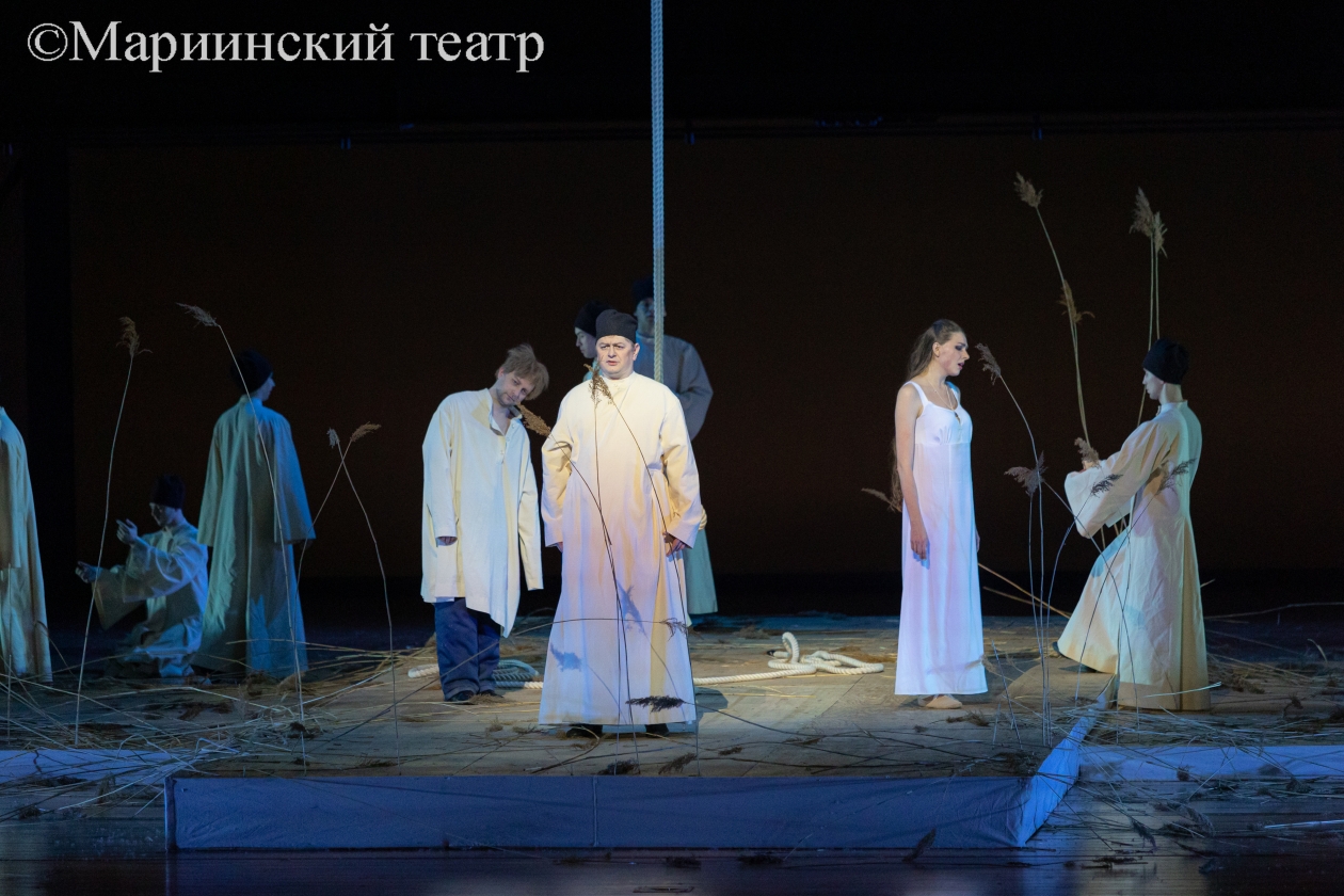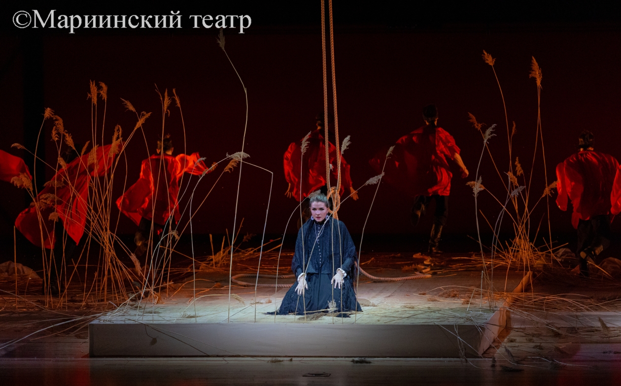 В тишине выходят на сцену артисты балетной труппы. Точнее, не выходят, а крадутся с разных сторон к планшету, на котором и будет происходить действие оперы. На планшете — заросли тростника, посередине которых — свисающая с колосников веревка. Зачем веревка? А затем же, зачем у Чехова "ружье на стене". Сначала путы Флягина в татарском плену, затем — знак отчаяния, когда княжеские пять тысяч к ногам Грушеньки кинул, а в самом конце — качели судьбы, с которых несчастной цыганке одна дорога — с крутого откоса в глубокую реку.
