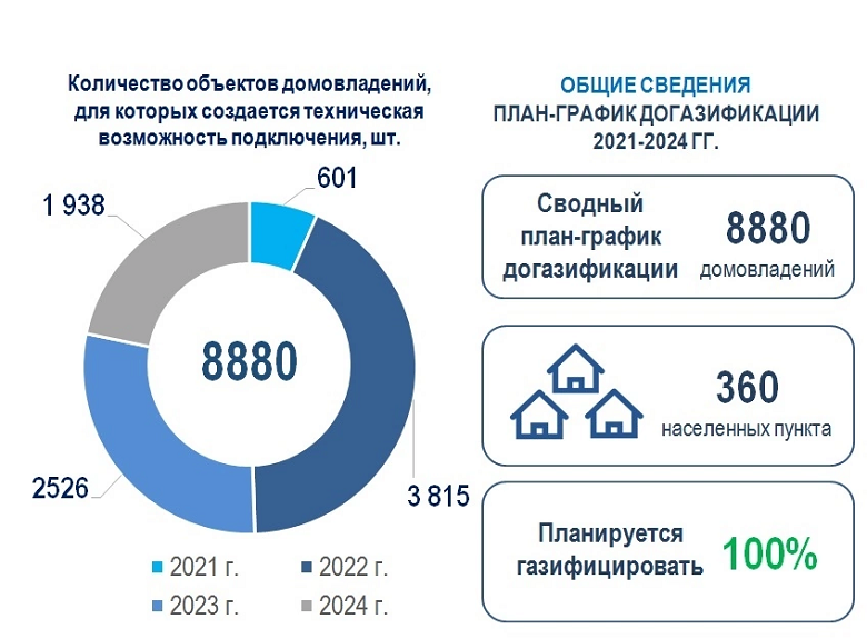 На сегодняшний день принято 10 605 заявок, заключено 9 987 договоров. В 6 073 случаях газ доведен до границ участков, а 1739 домов уже подключили.
