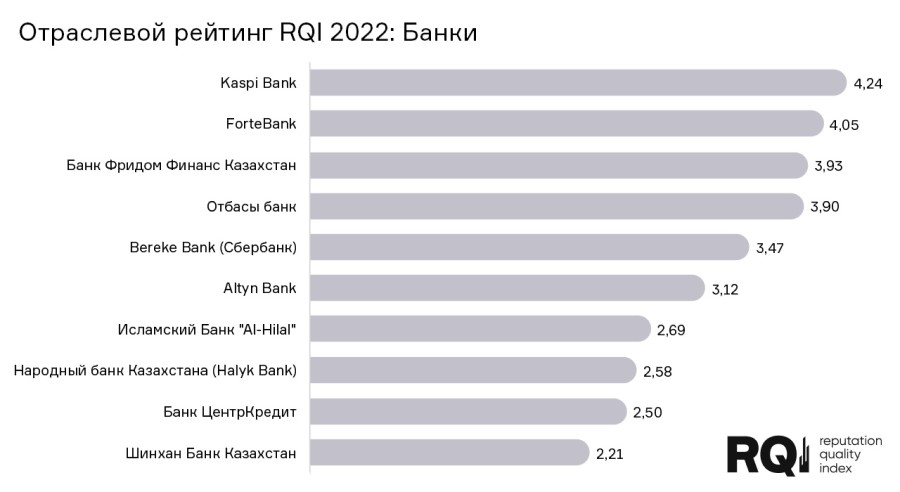 В результате исследования был сформирован рейтинг с интегральной оценкой качества управления репутацией бренда и локальными показателями эффективности коммуникационной политики компании. Так, лидирующую позицию в рейтинге RQI Kazakhstan в 2022 году занял банк Kaspi. На втором месте расположился банк ForteBank, а третья строчка принадлежит Банк Фридом Финанс Казахстан.