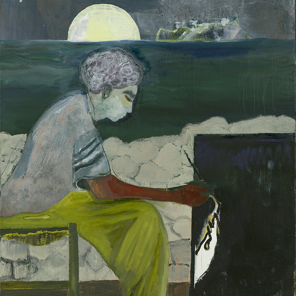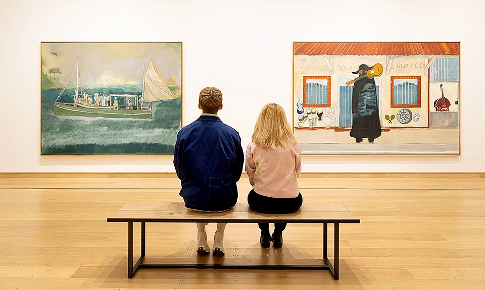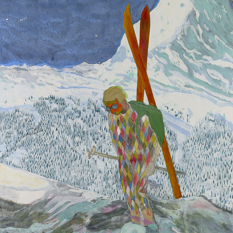 Экспозиция новых работ Питера Дойга стала первой выставкой современного художника по соседству со всемирно известным собранием живописи импрессионизма и постимпрессионизма Галереи Курто после завершившегося здесь в 2021 году трехлетнего ремонта. Она ютится всего в двух залах, еще один явно не помешал бы. Многие картины изображают сцены покоя и отдыха, но ни одна из них не создает ощущения беззаботности. На полотне «Ночные купальщики» (2011–2019) мы оказываемся в тринидадской бухте Маракас и становимся свидетелями ночной грезы, в которой синяя женщина и серый мужчина отдыхают то ли вместе, то ли на отдалении; они не смотрят друг на друга. «Альпинист» (2019–2022), ожидаемо выбранный Курто в качестве заглавной работы выставки, изображает лыжника в костюме Арлекина. Полотно высится над нами, создавая безупречную взаимосвязь между зрителем, пиком Маттерхорн на заднем плане и нелепой фигурой в половину человеческого роста. Мы ощущаем глубинную близость с арлекином; при этом его отрешенность и костюм вызывают отчуждение — такое можно испытать, столкнувшись с участником костюмированной вечеринки, отбившимся от компании.