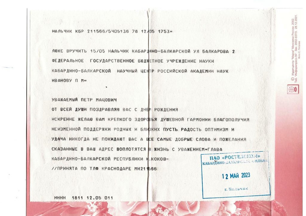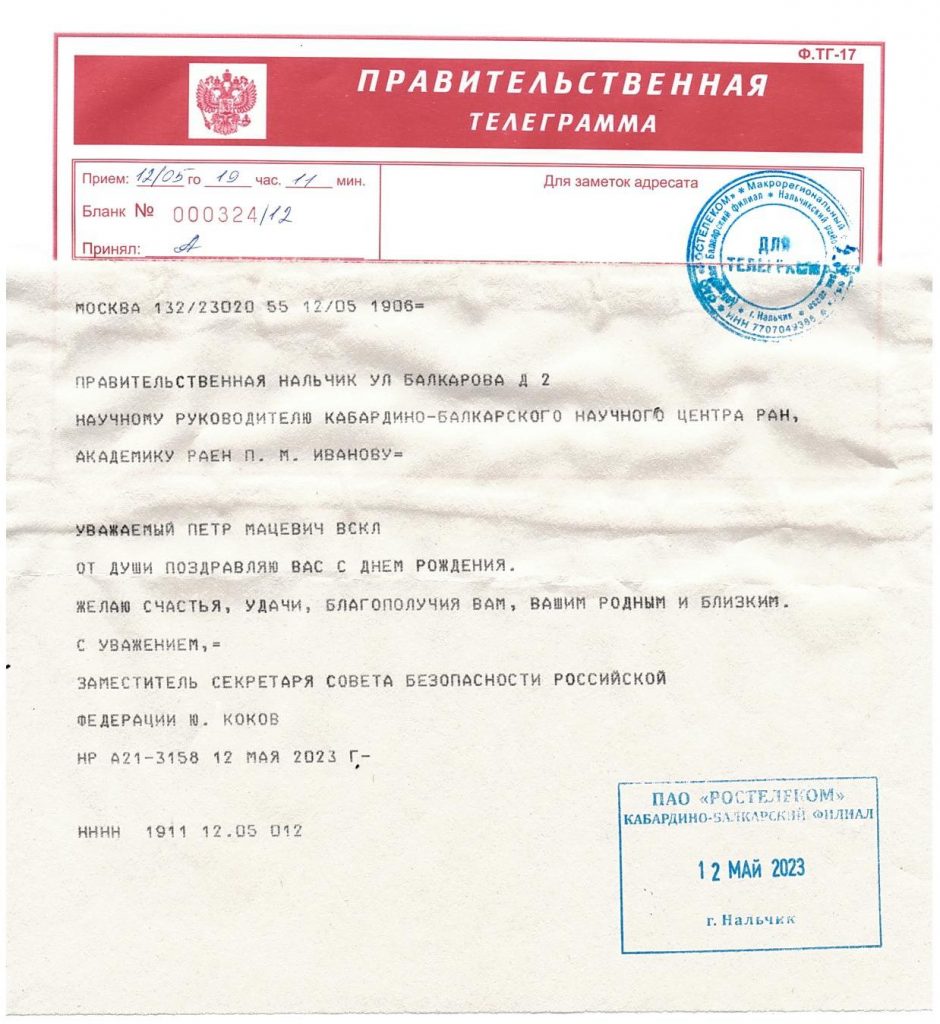 В день рождения  Петра Мацовича поступают многочисленные поздравления. Среди них телеграммы от заместителя секретаря Совета безопасности РФ Ю.А. Кокова и Главы Кабардино-Балкарской республики К.В. Кокова.