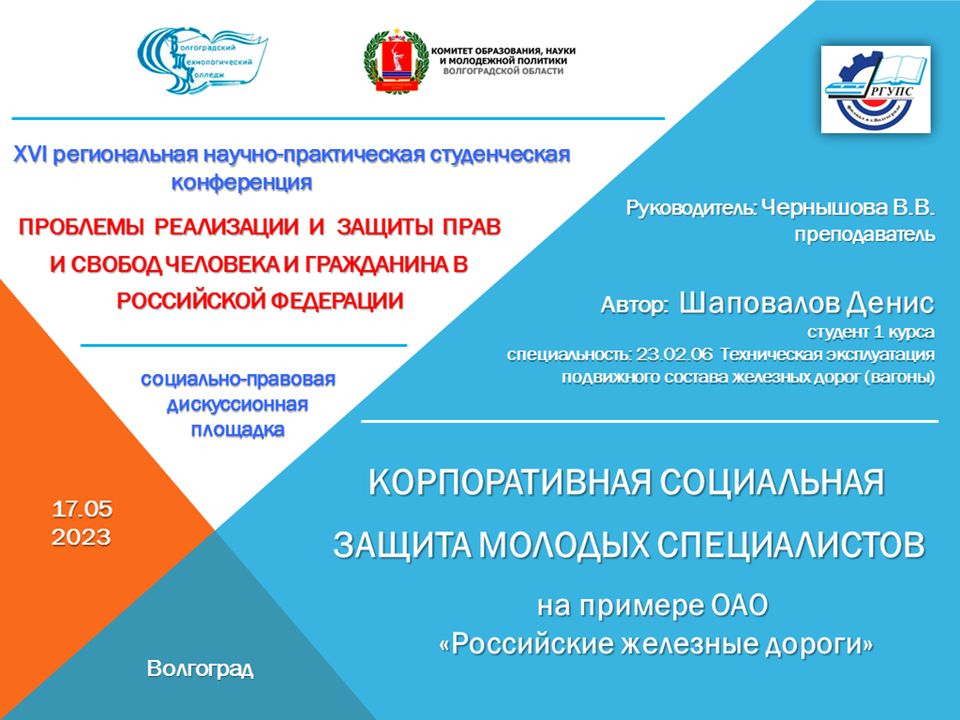 Волгоградский техникум железнодорожного транспорта – филиал РГУПС представил студент 1 курса специальности 23.02.06 Техническая эксплуатация подвижного состава железных дорог (вагоны) Денис Шаповалов с проектом «Корпоративная социальная защита молодых специалистов: на примере ОАО «Российские железные дороги» (наставник – В.В. Чернышова).
