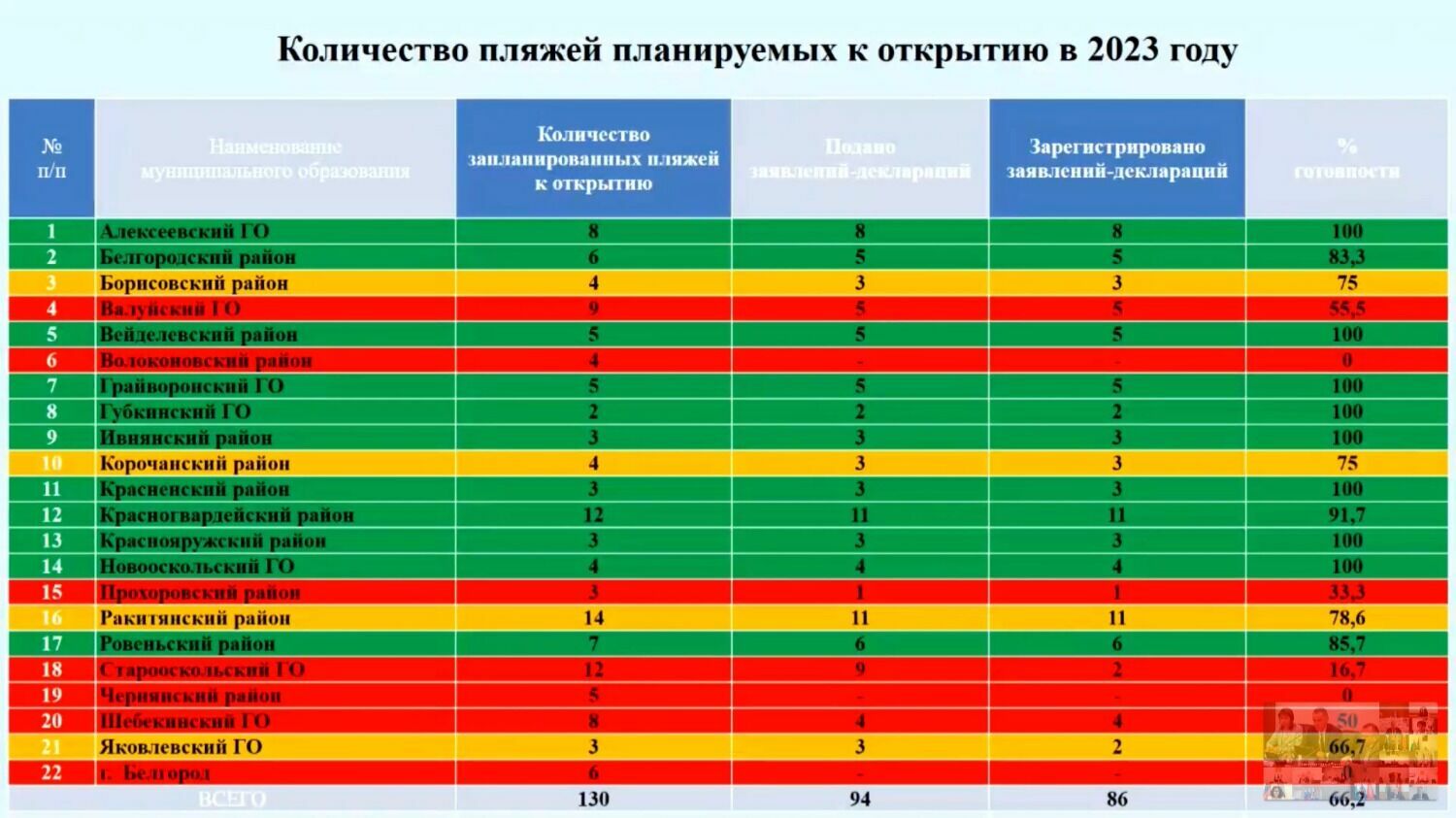 По данным заместителя губернатора Ивана Будлова, всего в текущем году в Белгородской области откроют 130 пляжей. Документы, которые подтверждают наличие необходимого снаряжения, спасательных средств, проведения водолазного обследования есть у 11 муниципалитетов. Они находятся в «зелёной» зоне.