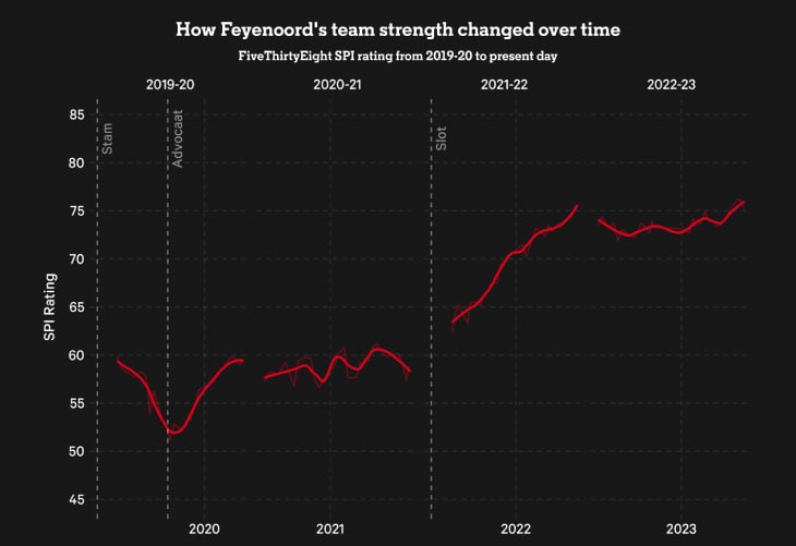 Если вы хотите количественно оценить улучшение «Фейеноорда» под руководством Слота, рассмотрите индекс футбольной силы FiveThirtyEight (см. выше), который использует базовые показатели для расчета атакующей и оборонительной силы команды. Приход Слота в клуб совпал с неуклонным подъемом в рейтинге. Сейчас у них 76,6 балла, 21-е место в мировом футболе. Неплохо для клуба Эредивизи. Но вот, пожалуй, самое убедительное доказательство того, что в Слоте есть что-то особенное. Летом после того первого сезона его команда «Фейеноорд» была разобрана по частям. Лучший бомбардир Луис Синистерра был продан в «Лидс». Маласия перешел в «Юнайтед». Маркос Сенеси в «Борнмут». Срок аренды Нельсона закончился, и он вернулся в «Арсенал». Полузащитник Фредрик Эурснес перешел в «Бенфику». Гус Тиль (бывший в аренде в «Фейеноорде») перешел в ПСВ. Все четыре игрока, забившие в предыдущем сезоне двузначные числа голов, ушли. Из команды, которая вышла в финал Лиги конференций меньше года назад, в клубе осталось только четверо. И все же «Фейеноорд» прибавил. Кёкчю и еще несколько человек остались, но пришел Сантьяго Хименес, ставший их лучшим бомбардиром. Словацкий защитник Давид Ханцко прибыл из пражской «Спарты» и блистает. Идрисси, сыгравший главную роль в «Алкмаре» Слота был спасен из «Севильи» арендой. Виффер и Хартман, по сути, появились из ниоткуда и теперь являются полноправными игроками сборной. Они заняли первое место в Эредвизи незадолго до перерыва на чемпионат мира и с тех пор не уступали его. Теперь они чемпионы. Несмотря на то, что «Фейеноорд» является одним из «большой тройки» голландских клубов, наряду с «Аяксом» и ПСВ, недавнее количество трофеев у команды относительно скромное. До этого сезона они выиграли Эредивизи только один раз с начала века, поэтому этот успех нельзя недооценивать.