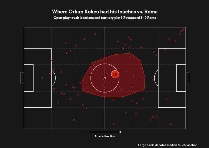 Он не сторонник жесткой линии поведения и не приверженец строгой дисциплины. Он делает упор на позитив. Когда его видеоаналитики собирают подборки клипов для просмотра игроками, позволяя им тщательно изучить свои выступления, он просит добавлять в них побольше положительных моментов. В частности, последний эпизод всегда положительный, поэтому игроки покидают сессию с хорошим настроением. Возможно, игроком, который больше всего выиграл от пребывания Слота в «Фейеноорде», был Кёкчю, который является воспитанником академии клуба. Кёкчю, ранее считавшийся талантливым, но не слишком выдающимся плеймейкером, вернулся с Евро-2020, где выступал в составе сборной Турции, и обнаружил, что все изменилось. Он больше не мог только творить на поле и позволять своим товарищам по команде делать за него всю беговую работу. После первого официального матча Слота во главе «Фейенорда», игры Лиги конференций против косовской команды «Дрита», новый тренер сел рядом с Кёкчю во время полета домой и объяснил, что он ждет от него большего. Больше бега, больше давления, больше отработки в обороне. И это сработало. После всего нескольких недель совместной работы Слот убедил Кёкчю, что ему необходимо значительно улучшить свое физическое состояние. Кёкчю дружит с Маласией (они вместе прошли через молодежную команду «Фейеноорда») и наблюдал за физическим развитием защитника с тех пор, как он начал работать с тренером по физподготовке в Роттердаме. Кёкчю пошел к тому же тренеру и через несколько недель стал тем работящим игроком, которого требовал Слот. «Если взглянуть на него сейчас, вы увидите современного полузащитника», — говорит Краббендам. Чтобы проиллюстрировать этот момент, взгляните на эту карту касаний Кёкчю в победном первом матче «Фейеноорда» с «Ромой» в четвертьфинале Лиги Европы в апреле. Концентрация в центре, но очень мало участков поля, которые он не покрывал.