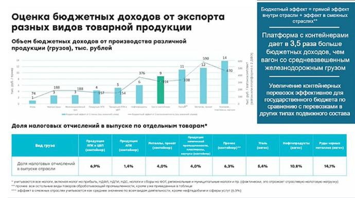 В качестве доказательства первый заместитель генерального директора Центра стратегических разработок (ЦСР) Татьяна Горовая указала, что контейнерные грузы дают в 3,5 раза больше доходов, чем средневзвешенный объём других грузов в ж/д вагонах.