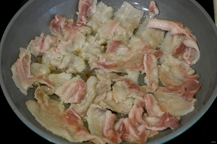 В сковороде нагрейте масло. Грудинку нарежьте тонкими полосками и выложите на сковороду.