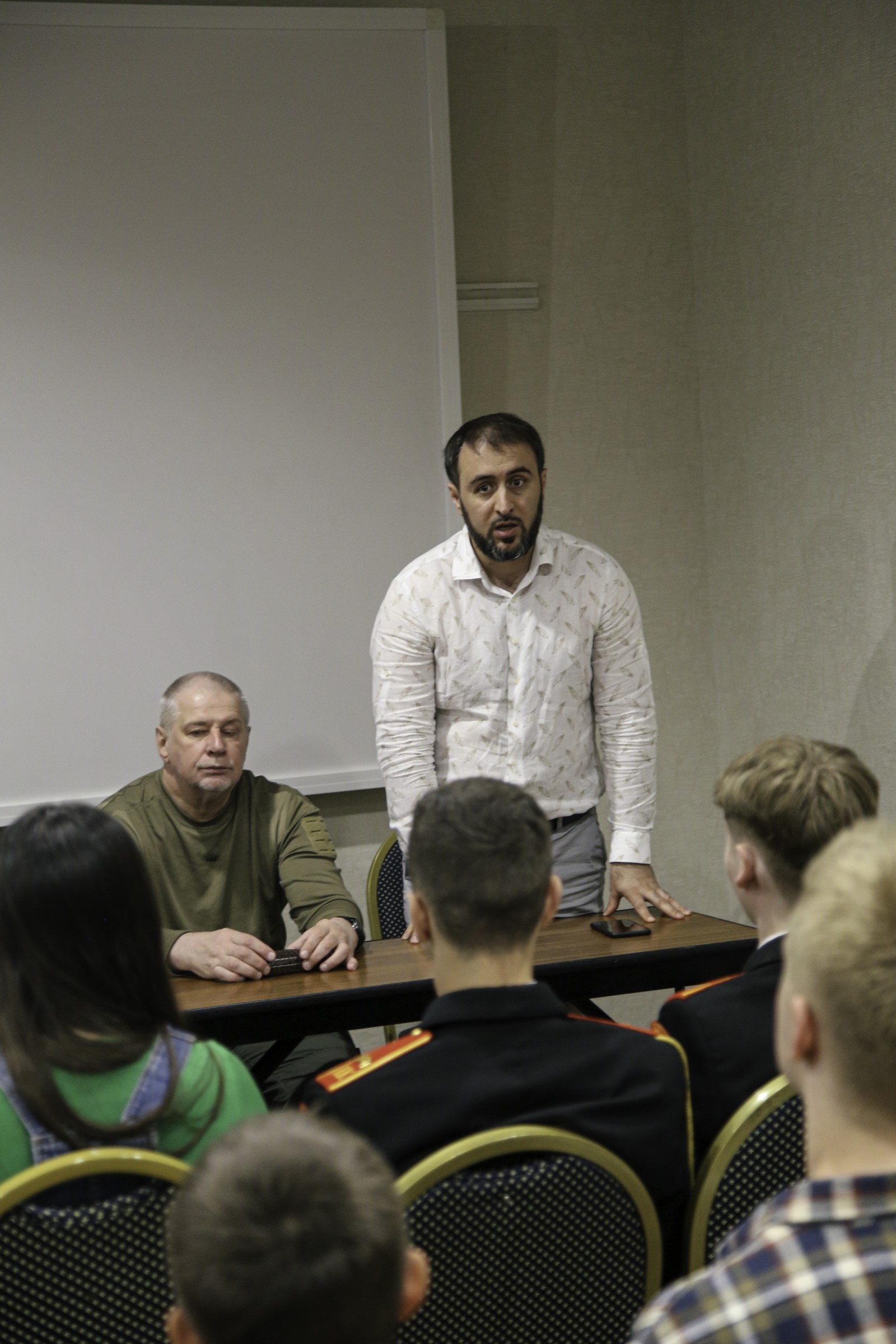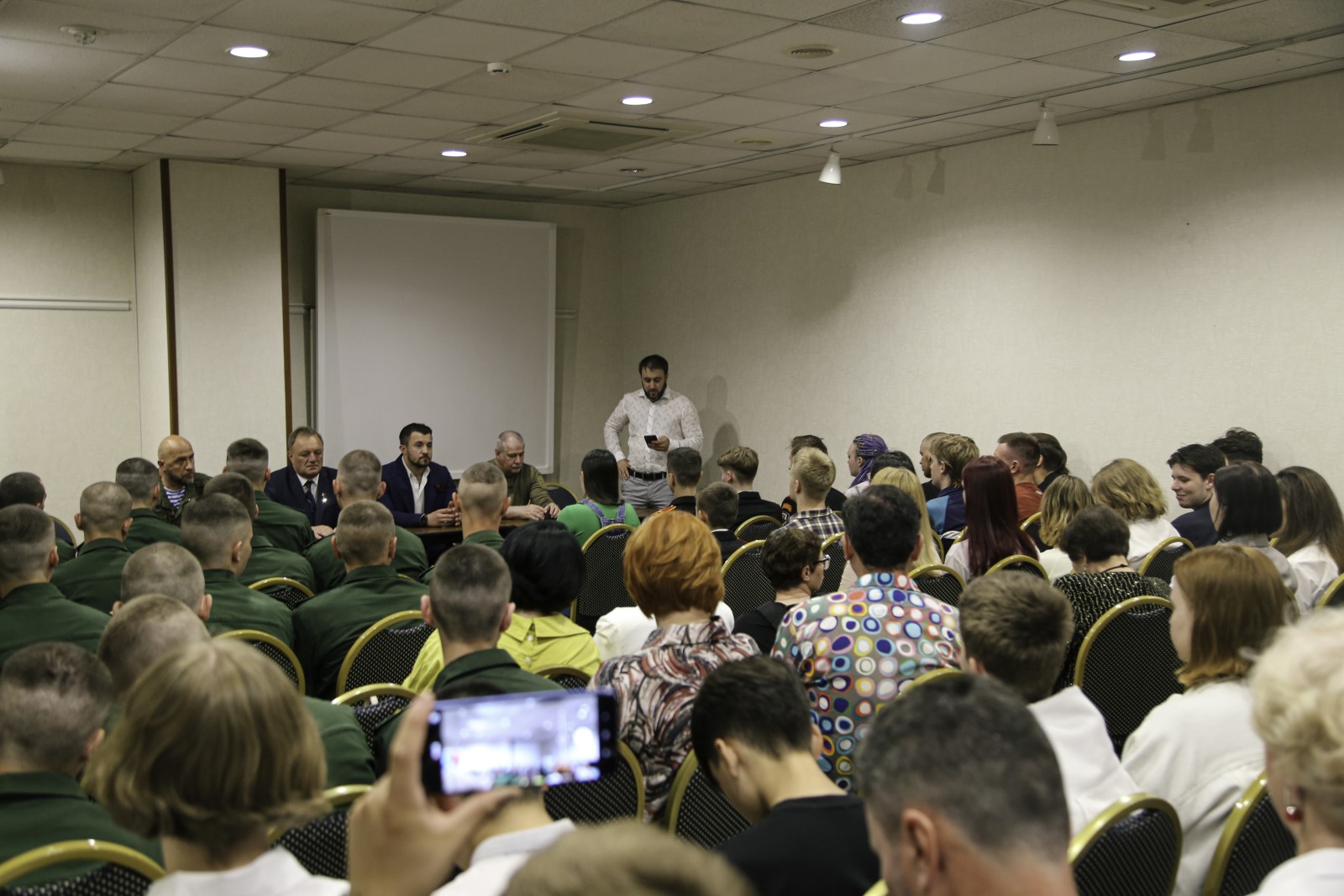 Начался патриотический вечер с выставки портретов героев СВО с описанием их подвигов, совершенных во благо Родины. Продолжила программу мероприятия панельная дискуссия. В диалог были вовлечены не только герои специальной военной операции, но и известные артисты, ветераны боевых действий в горячих точках, молодые курсанты. В дискуссии приняли участие: Сергей Авдеев, военнослужащий Народной милиции ДНР; Александр Даркович, Герой России, советский, российский офицер морской пехоты, полковник; Василий Пасечник, лауреат Национальной премии России, финалист проекта «Голос», резидент Арт-кластера «Таврида»; Вячеслав Корнеев, участник СВО, российский военнослужащий спецназа ВДВ, участник боевых действий на Северном Кавказе, кавалер Ордена Мужества, музыкант, автор-исполнитель.