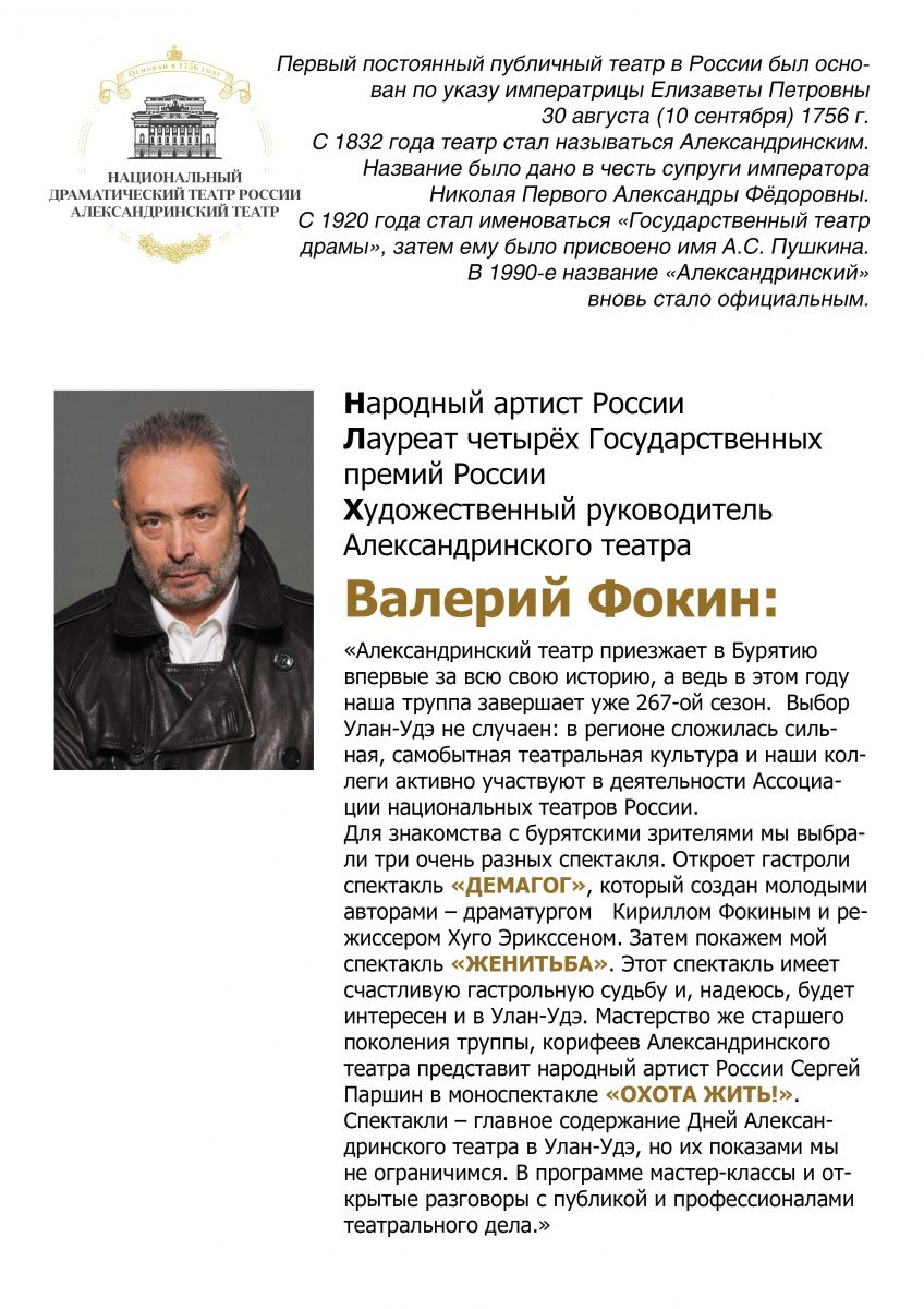 Александринский театр выбрал Улан-Удэ для гастролей не случайно. В регионе сложилась сильная, самобытная театральная культура. Буряад театр активно участвует в деятельности Ассоциации национальных театров России.