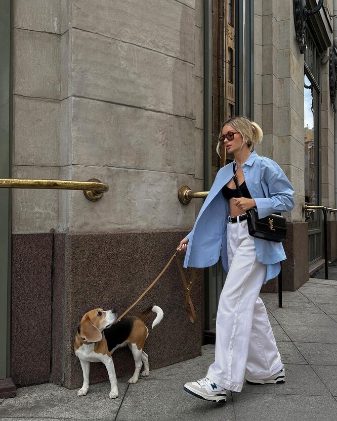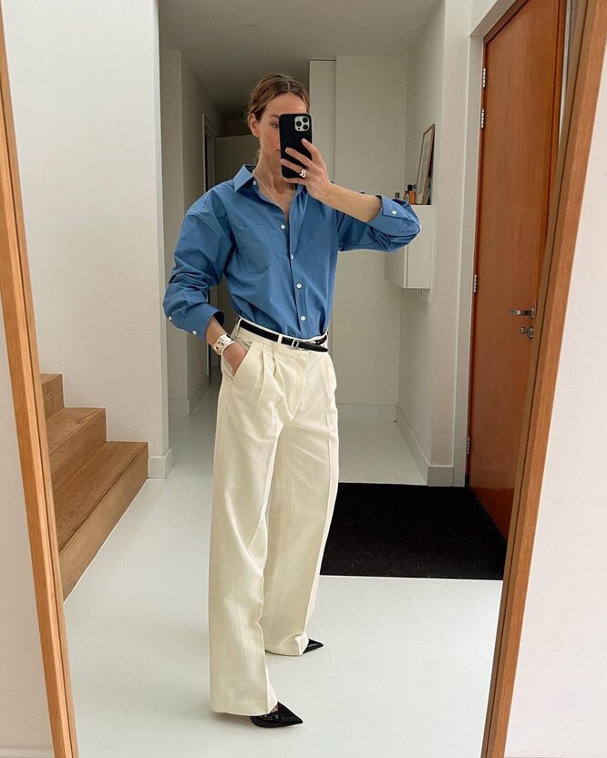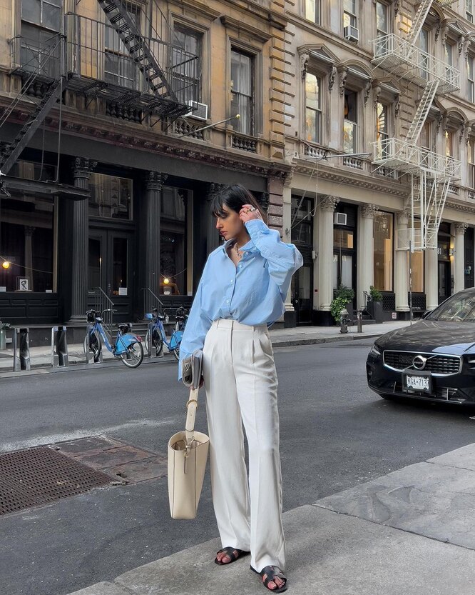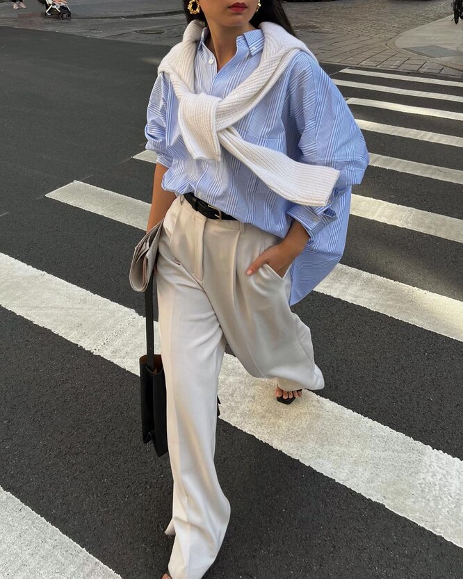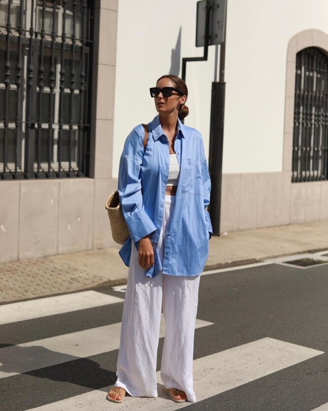 Белые брюки давно стали незаменимой униформой на летний сезон. Носить их можно буквально везде: от офиса до свидания, от жаркой вечеринки в центре города до морского побережья. Универсальная пара из тонко ткани легко подойдет к любой одежде: брюки легко комбинируются с майками, футболками, блузами и рубашками. Однако именно с последними белые брюки особенно полюбили носить инфлюенсеры. Причем не с любыми рубашками, а обязательно голубого цвета. Рассказываем, почему это комбо - идеально для лета.