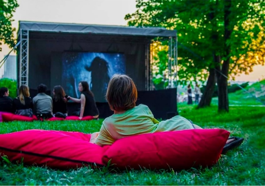 21:45. Летний кинотеатр в парке Олимпийской деревни, сцена на воде