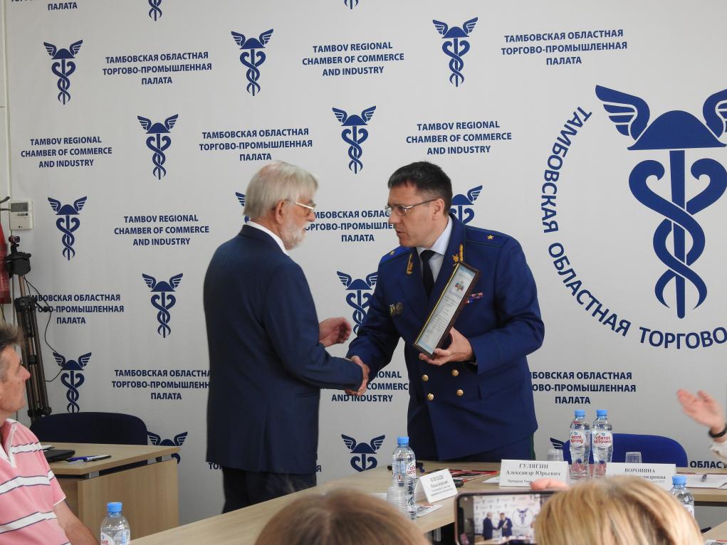 Открывая встречу, прокурор Тамбовской области вручил благодарственное письмо Уполномоченному по защите прав предпринимателей в Тамбовской области Михаилу Козельцеву, поблагодарив его за плодотворное сотрудничество с надзорным ведомством в вопросах защиты прав субъектов предпринимательской деятельности на протяжении 10 лет.