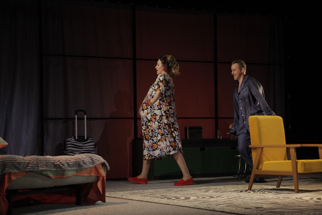 Итак, ритм. Чередование каких-либо событий, происходящее с определенной последовательностью, частотой, скорость протекания, совершения чего-либо. И темп. Скорость протекания того, что задано ритмом. Камертоном того и другого в спектакле, поставленном Николаем Тимошенко в Горьковке, как мне кажется, как раз является сцена родов. Яркая, комическая, даже буффонадная, виртуозная по исполнению. Символизирующая верхнюю точку отношений Джорджа и Дорис (ведь в какой-то мере на свет появляется их общий ребенок). Всё, что было до этого, — разгон качелей до максимально возможной скорости. Всё, что после этого, — постепенное замедление до полной остановки.