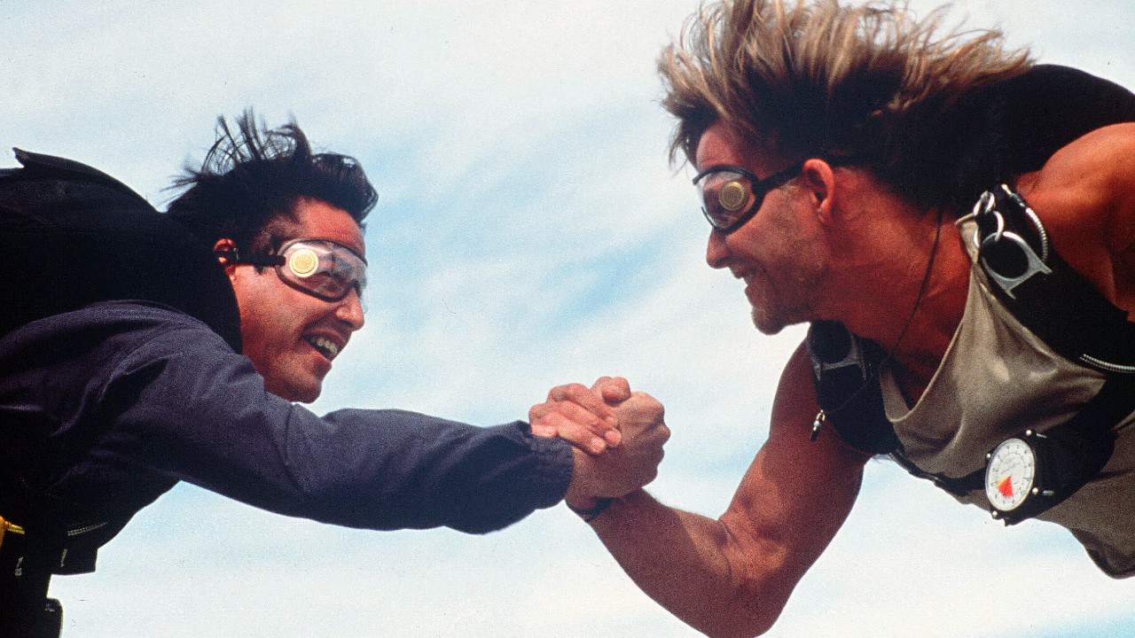 Между тем, Киану Ривз демонстрирует прямолинейный образ Джонни Юты. Когда они становятся друзьями, Бодхи открывает мир Юты для экстремальной жизни. Просветление Юты прерывается, когда он узнает, что Бодхи и его друзья-пляжные бездельники – грабители банков, которых он искал.