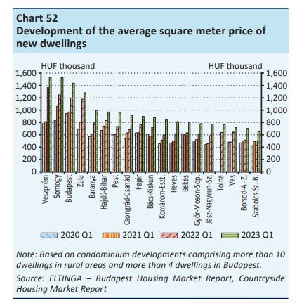 Самыми высокими цены были в округе Веспрем (северный берег озера Балатон) – 1,53 миллиона форинтов (4030 евро) за квадратный метр. В годовом сравнении средняя цена квадратного метра в этом округе выросла на 12%, а за полгода уже наблюдалось падение на 8%. В округе Сомоги, в основном это проекты вокруг озера Балатон, средняя цена схожая. Далее следует Будапешт, где «квадрат» в недавно построенных домах стоит 1,42 млн венгерских форинтов (3 739 евро). Самые низкие цены на жилье зафиксированы в населенных пунктах Szabolcs-Szatmár-Bereg и Borsod-Abaúj-Zemplén.