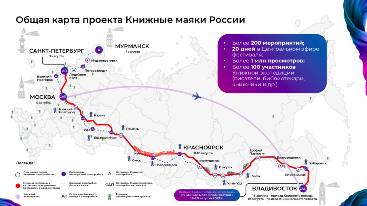 Впервые в истории уникальная Книжная экспедиция на поездеи других средствах перемещения совершит путешествие с культурной программой по всей России: от Санкт-Петербурга до Владивостока. Книжная экспедиция — символ объединения людей на всей протяженности нашей огромной страны вокруг книг, общих ценностей и книжных пространств, таких как библиотеки, книжные магазины и музеи. Книжная экспедиция будет зажигать «Книжные маяки России» в городах по всему своему пути. Это —Санкт-Петербург,Москва, Нижний Новгород, Казань, Екатеринбург, Тюмень, Омск, Новосибирск, Красноярск, Иркутск, Улан-Удэ, Чита, Хабаровск, Владивосток.