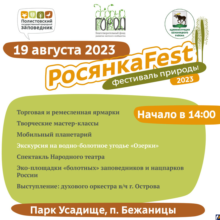 Специалисты Полистовского заповедника проведут экскурсии на болотце «Озерки». Прямо рядом с местом проведения фестиваля его гости смогут увидеть участок нетронутой природы, рассмотреть болотные растения, в том числе хищную росянку, узнать об экологии и образовании верховых болот, послушать болотных птиц - если повезет) и насекомых – это наверняка.