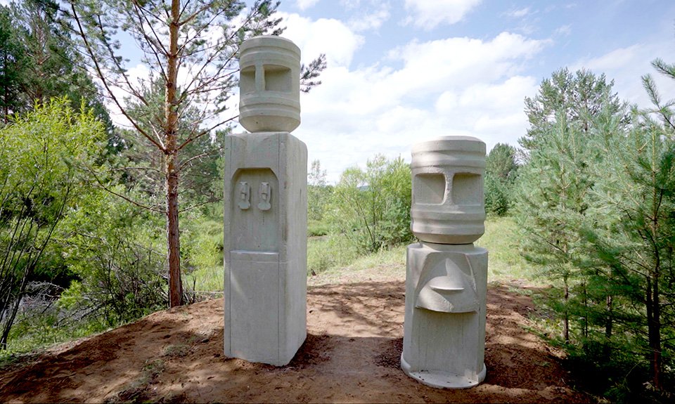 Немного глубже в лес, также на берегу реки, среди деревьев стоят «Идолы» Александра Повзнера. Это два огромных истукана в форме кулера для воды, отлитые из бетона. Перевернутые бутыли обретают сходство со статуями с острова Пасхи — как брутальностью черт (с нависающими надбровьями и длинным носом ручки), так и весом (в одном 1,3, в другом 2,5 т).