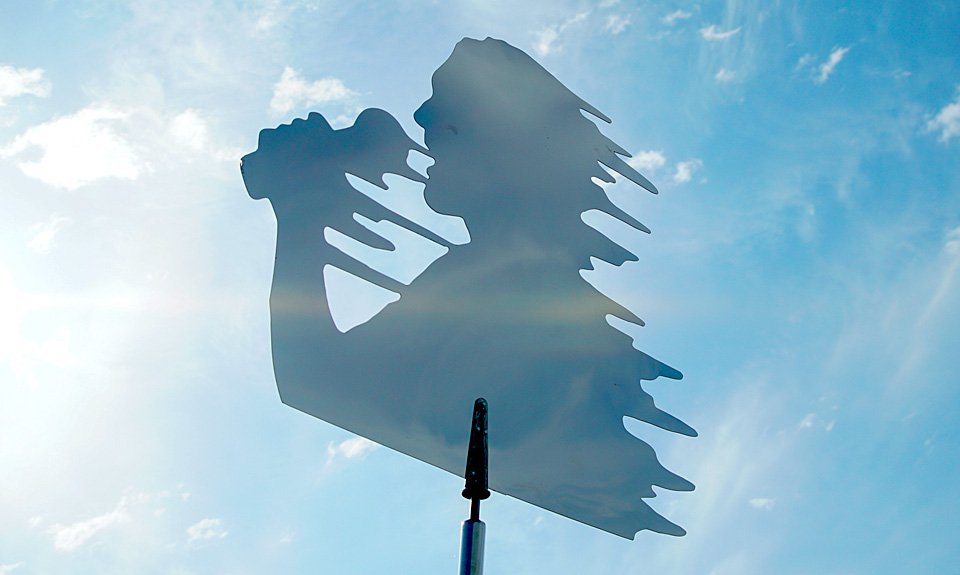 Художник Иван Плющ для фестиваля «Тужи Арт» развил тему способа вписаться в окружающую среду иначе. Его «Глашатаи», головы с микрофонами в руках характерных для художника стекающих форм, мало того что зеркальные — еще и укреплены как флюгеры, и под ветром они непрерывно разворачиваются туда-сюда.