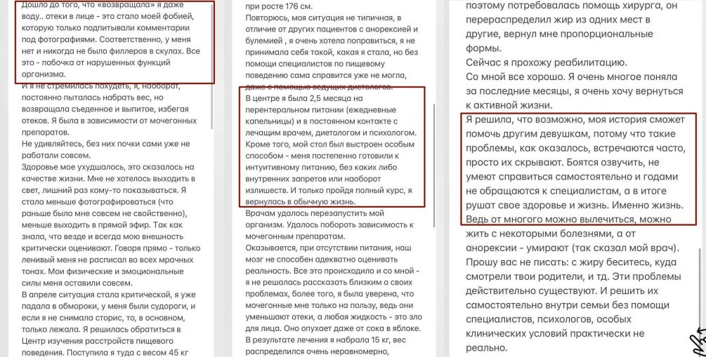 «В апреле ситуация стала критической, я уже падала в обмороки, у меня были судороги, и если я не снимала сторис, то, в основном, только лежала. В Центр изучения расстройств я поступила с весом 45 кг при росте 176 см», - призналась Алена, - «2,5 месяца я была на парентеральном питании (ежедневные капельницы), в результате чего набрала 15 кг. Вес распределился очень неравномерно, поэтому потребовалась помощь хирурга - он перераспределил жир из одних мест в другие, вернул мне пропорциональные формы».