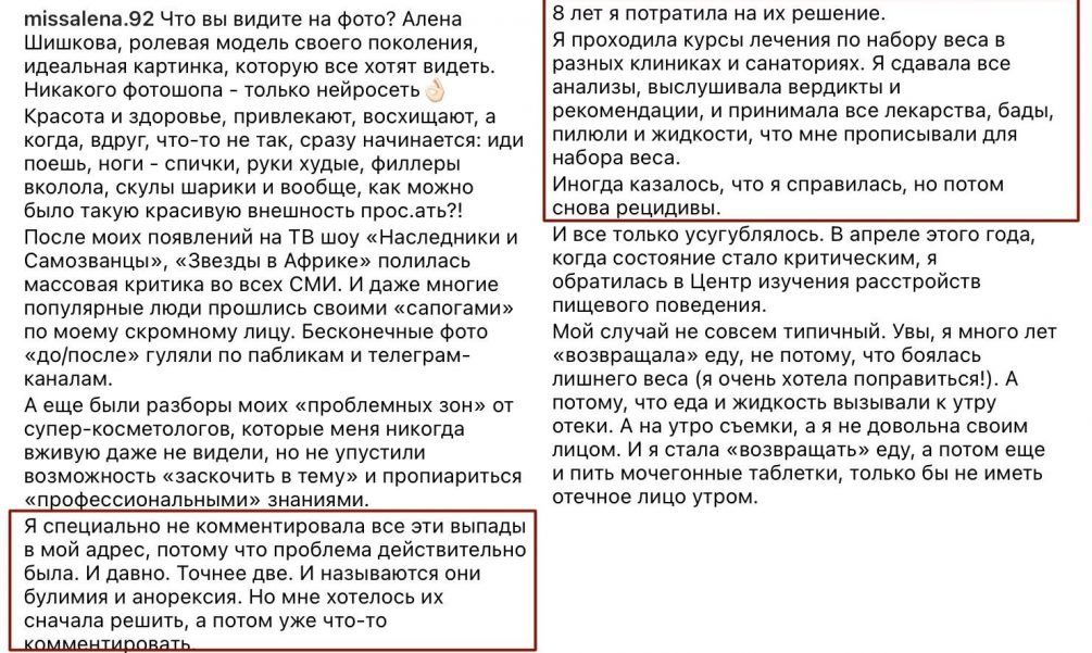 «Что вы видите на фото?», - поинтересовалась вице-мисс России под своим архивным снимком, - «Алена Шишкова, ролевая модель своего поколения, идеальная картинка, которую все хотят видеть. Красота и здоровье привлекают, восхищают, а когда, вдруг, что-то не так, сразу начинается: иди поешь, ноги - спички, руки худые, филлеры вколола, скулы шарики и вообще, как можно было такую красивую внешность прос*ать?!».