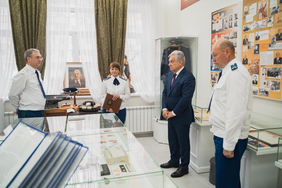 Для гостей проведена экскурсия по музею прокуратуры, где выставлены экспонаты, связанные с различными периодами ее деятельности, архивные документы, книги, монографии, периодические печатные издания и фотографии. Часть экскурсии была посвящена рассказу о работе органов прокуратуры Курской области в военные годы.