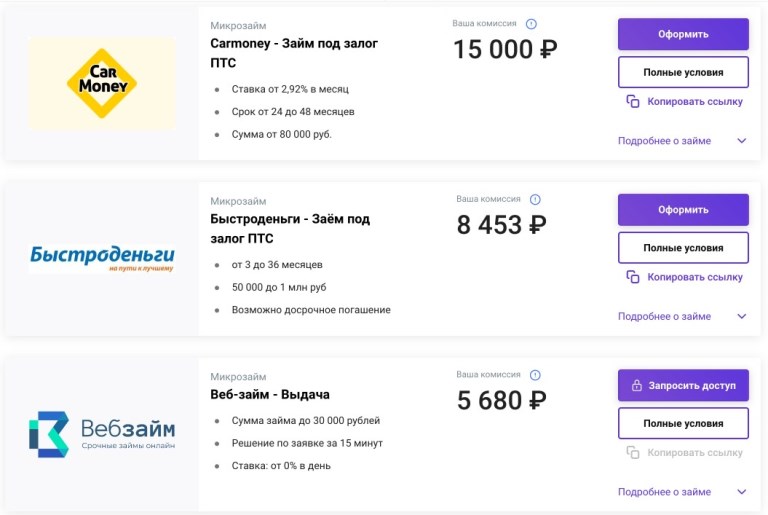 У нас вы можете заработать на микрозаймах 650-14 000 рублей за одного клиента. При этом минимальная сумма к выводу составляет 750 рублей. Вам доступны разные партнерские программы займов онлайн.