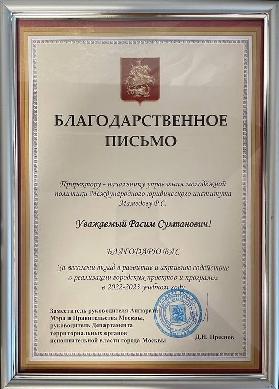 Проректор-начальник управления молодежной политики МЮИ Мамедов Р.С. получил благодарственное письмо «за весомый вклад в развитие и активное содействие в реализации городских проектов и программ в 2022-2023 учебном году» от заместителя руководителя Аппарата Мэра и Правительства Москвы, руководителя Департамента территориальных органов исполнительной власти города Москвы Д.Н. Преснова.