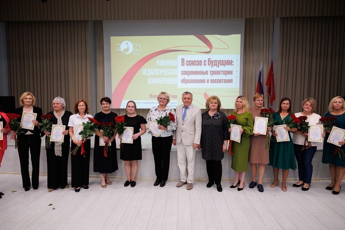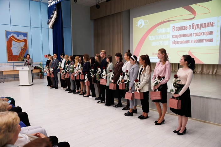По доброй традиции на августовской встрече 20 молодых специалистов были приняты в педагогическое сообщество Петродворцового района. Лучшим работникам вручили Почетные грамоты Министерства просвещения РФ.