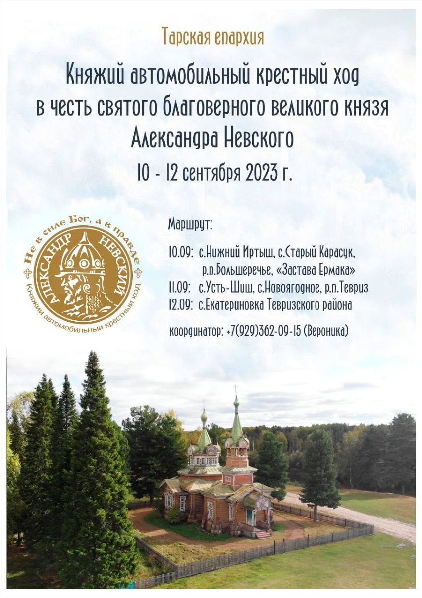 Тарская епархия проводит автомобильный Княжий крестный ход в пятый раз. Крестный ход выйдет 10 сентября от села Нижний Иртыш. Кульминацией его станет Божественная литургия в храме святого благоверного князя Александра Невского села Екатериновка Тевризского района.