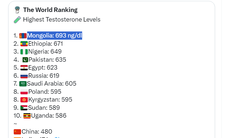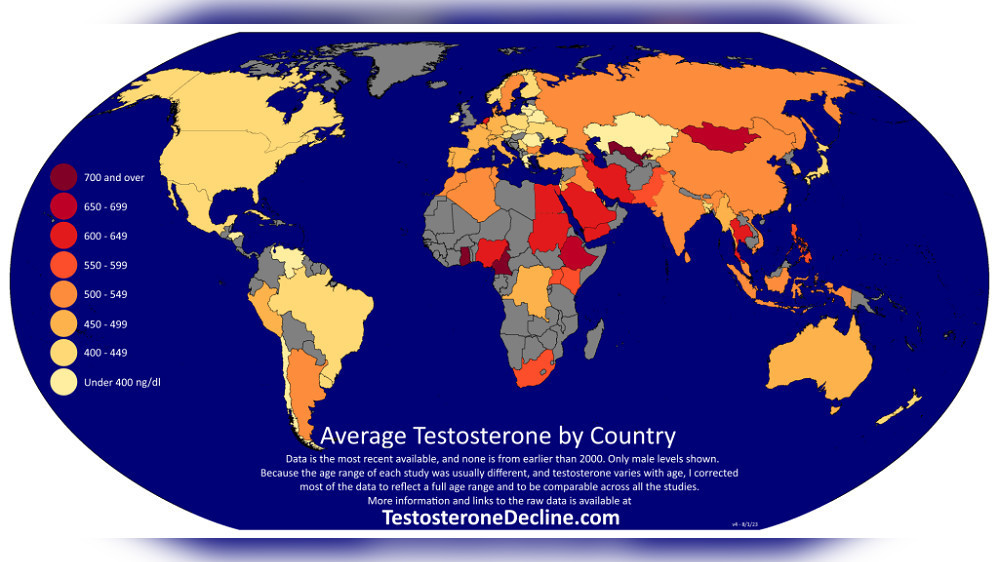 Вот топ-10 стран с самым высоким уровнем тестостерона от World population review: