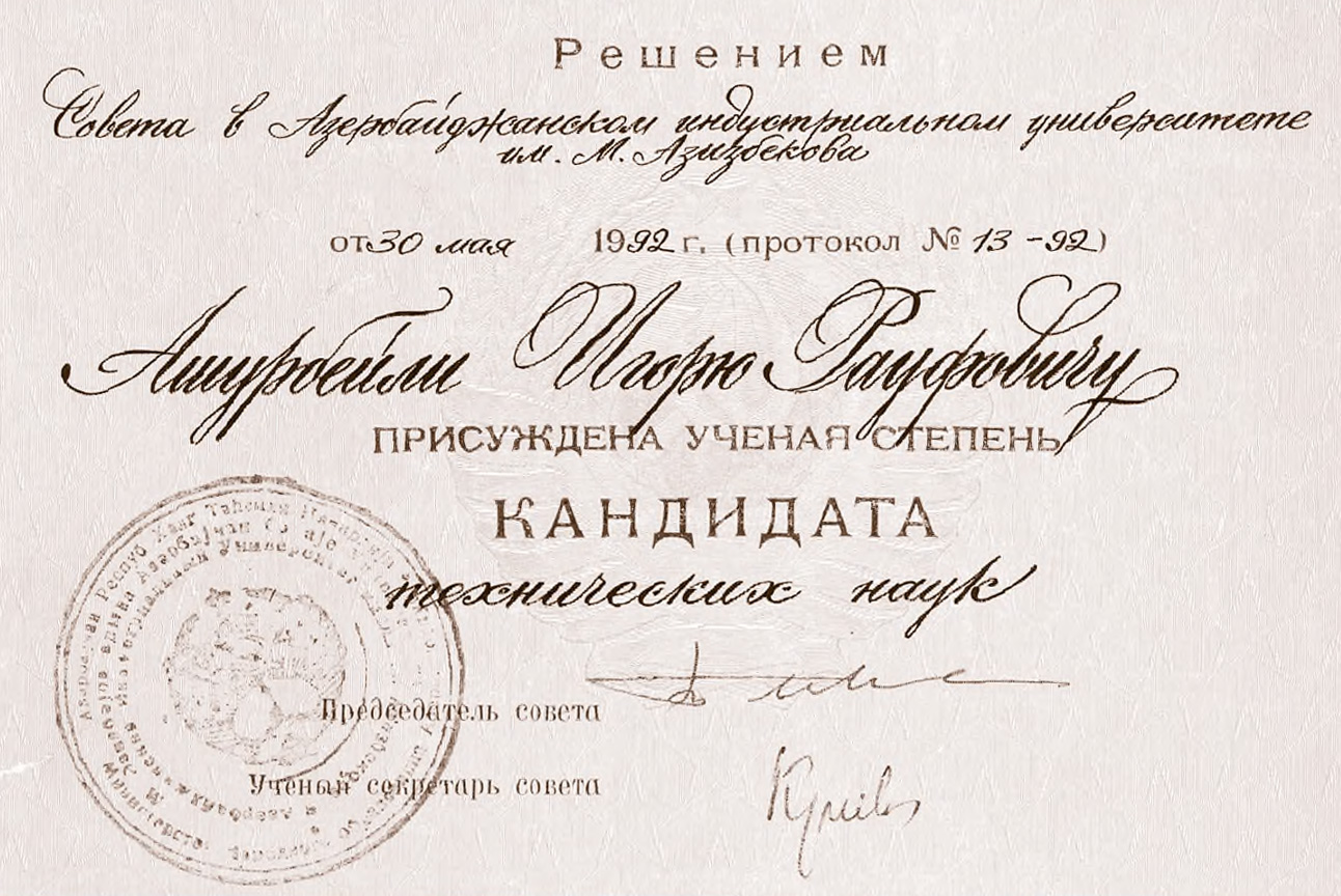Кандидатская диссертация, трудиться над которой Игорь Ашурбейли начал ещё в 1988 году, несмотря на огромную загруженность, постоянные разъезды между Москвой и Баку, к 1992 году обрела, наконец, законченную форму научной работы под названием «Вопросы построения децентрализованной системы автоматического регулирования технологических процессов в нефтепереработке». Решением Высшей аттестационной комиссии СССР И. Р. Ашурбейли была присуждена степень кандидата технических наук.